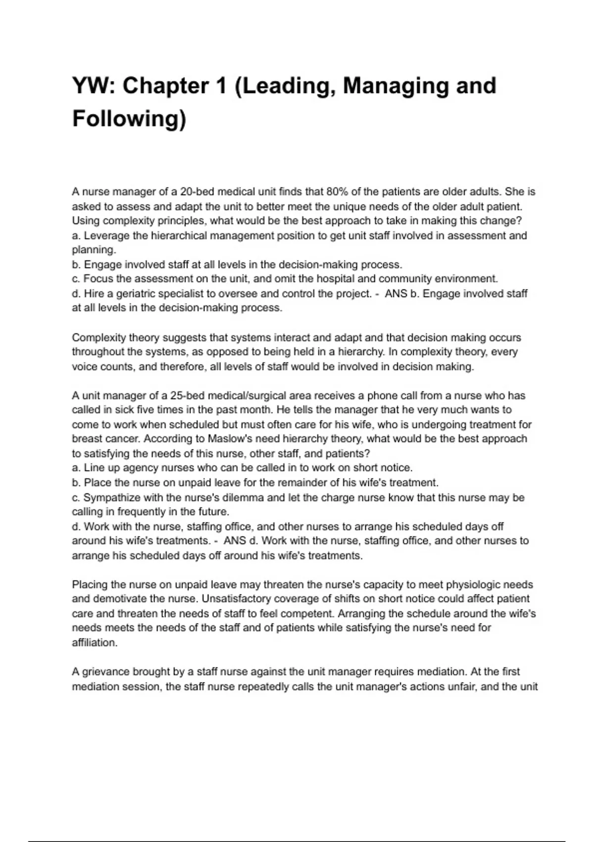 around his wife's treatments. - ANS d. Work with the nurse, staffing office, and other nurses to