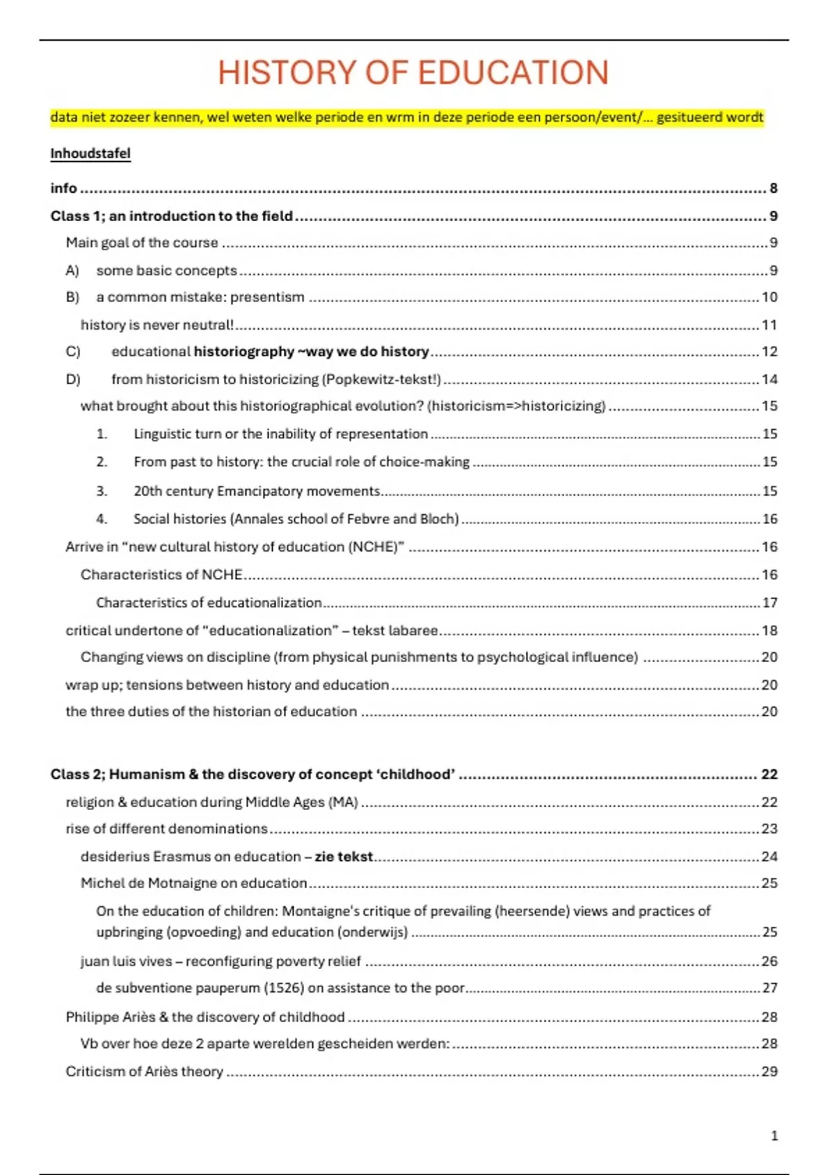Dit is een samenvatting van het vak history of education. Het vak wordt in Engels gegeven dus deze samenvatting is ook voornamelijk in Engels behouden. Soms staan er wel Nederlandse zinnen/kaders of soms zijn woorden tussen haakjes vertaald om het duidelijker te maken. Het document bevat zowel alles van de ppt's (inclusief foto's) en Engelse notities van de les (met dus af en toe vertaalde zinnen).
