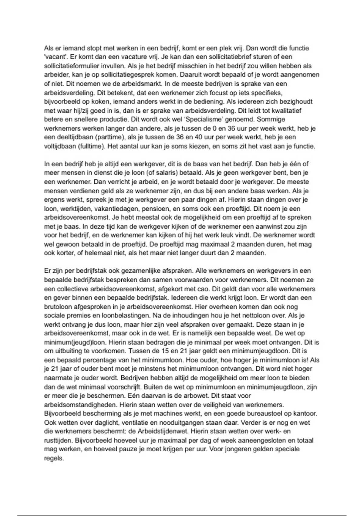 Als er iemand stopt met werken in een bedrijf, komt er een plek vrij. Dan wordt die functie 'vacant'. Er komt dan een vacature vrij. Je kan dan een sollicitatiebrief sturen of een sollicitatieformulier invullen. Als je het bedrijf misschien in het bedrijf zou willen hebben als arbeider, kan je op sollicitatiegesprek komen. Daaruit wordt bepaald of je wordt aangenomen of niet. Dit noemen we de arbeidsmarkt. In de meeste bedrijven is sprake van een arbeidsverdeling. Dit betekent, dat een werknemer zich focust op iets specifieks, bijvoorbeeld op koken, iemand anders werkt in de bediening. Als iedereen zich bezighoudt met waar hij/zij goed in is, dan is er sprake van arbeidsverdeling. Dit leidt tot kwalitatief betere en snellere productie. Dit wordt ook wel ‘Specialisme’ genoemd. Sommige werknemers werken langer dan andere, als je tussen de 0 en 36 uur per week werkt, heb je een deeltijdbaan (parttime), als je tussen de 36 en 40 uur per week werkt, heb je een voltijdbaan (fulltime). Het aantal uur kan je soms kiezen, en soms zit het vast aan je functie. In een bedrijf heb je altijd een werkgever, dit is de baas van het bedrijf. Dan heb je één of meer mensen in dienst die je loon (of salaris) betaald. Als je geen werkgever bent, ben je een werknemer. Dan verricht je arbeid, en je wordt betaald door je werkgever. De meeste mensen verdienen geld als ze werknemer zijn, en dus bij een andere baas werken. Als je ergens werkt, spreek je met je werkgever een paar dingen af. Hierin staan dingen over je loon, werktijden, vakantiedagen, pensioen, en soms ook een proeftijd. Dit noem je een arbeidsovereenkomst. Je hebt meestal ook de mogelijkheid om een proeftijd af te spreken met je baas. In deze tijd kan de werkgever kijken of de werknemer een aanwinst zou zijn voor het bedrijf, en de werknemer kan kijken of hij het werk leuk vindt. De werknemer wordt wel gewoon betaald in de proeftijd. De proeftijd mag maximaal 2 maanden duren, het mag ook korter, of helemaal niet, als het maar niet langer duurt dan 2 maanden