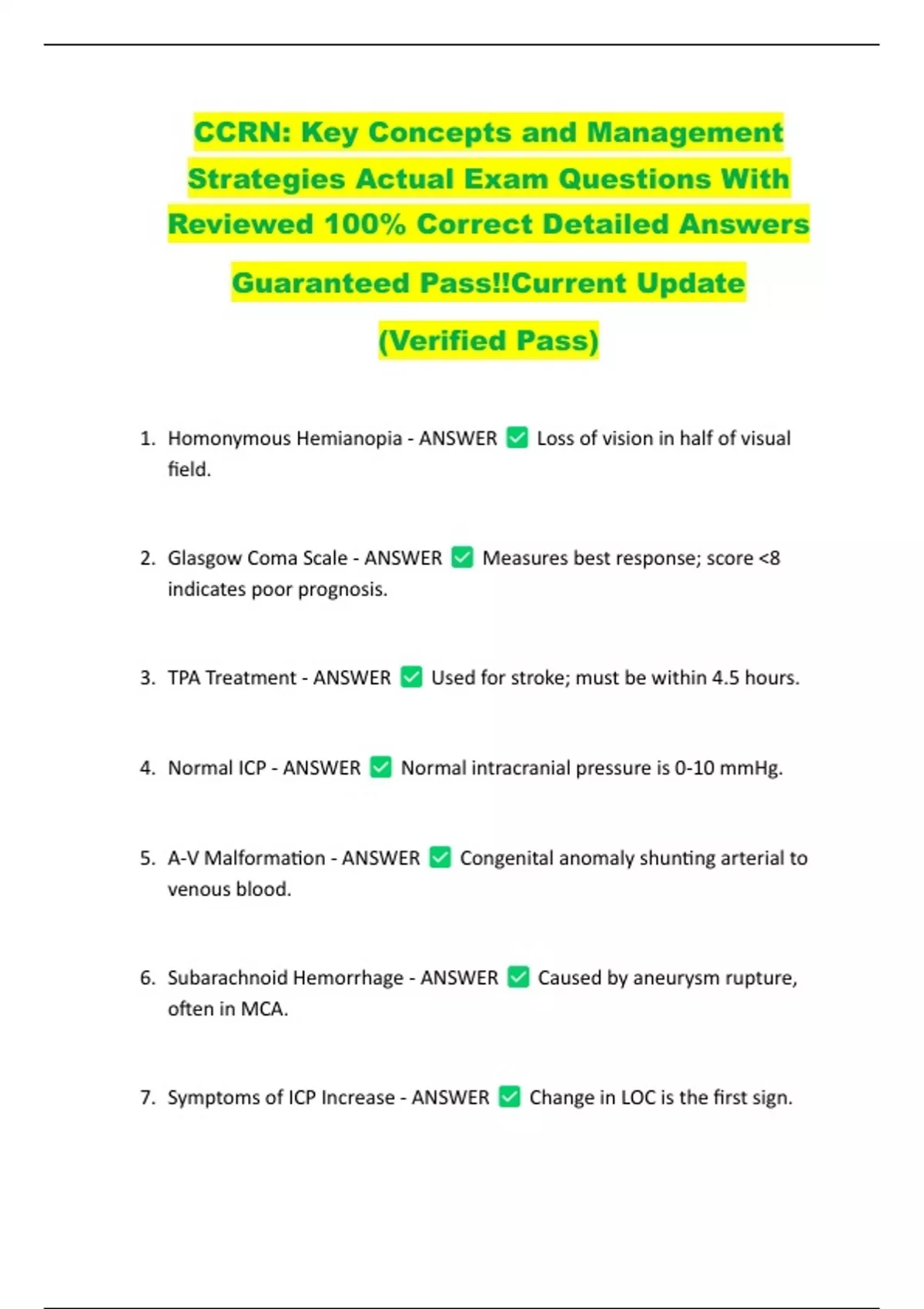 CCRN: Key Concepts and Management Strategies Actual Exam Questions With Reviewed 100% Correct Detailed Answers Guaranteed Pass!!Current Update (Verified Pass) 1. Homonymous Hemianopia - ANSWER Loss of vision in half of visual field. 2. Glasgow Coma Scale - ANSWER Measures best response; score <8 indicates poor prognosis. 3. TPA Treatment - ANSWER Used for stroke; must be within 4.5 hours 4. Normal ICP - ANSWER Normal intracranial pressure is 0-10 mmHg. 5. A-V Malformation - ANSWER Congenital anomaly shunting arterial to venous blood. 6. Subarachnoid Hemorrhage - ANSWER Caused by aneurysm rupture, often in MCA. 7. Symptoms of ICP Increase - ANSWER Change in LOC is the first sign. 8. Classic Aneurysm Symptoms - ANSWER Explosive headache, decreased LOC, nuchal rigidity. 9. Hypotension with ICP - ANSWER Bad; decreases cerebral perfusion.