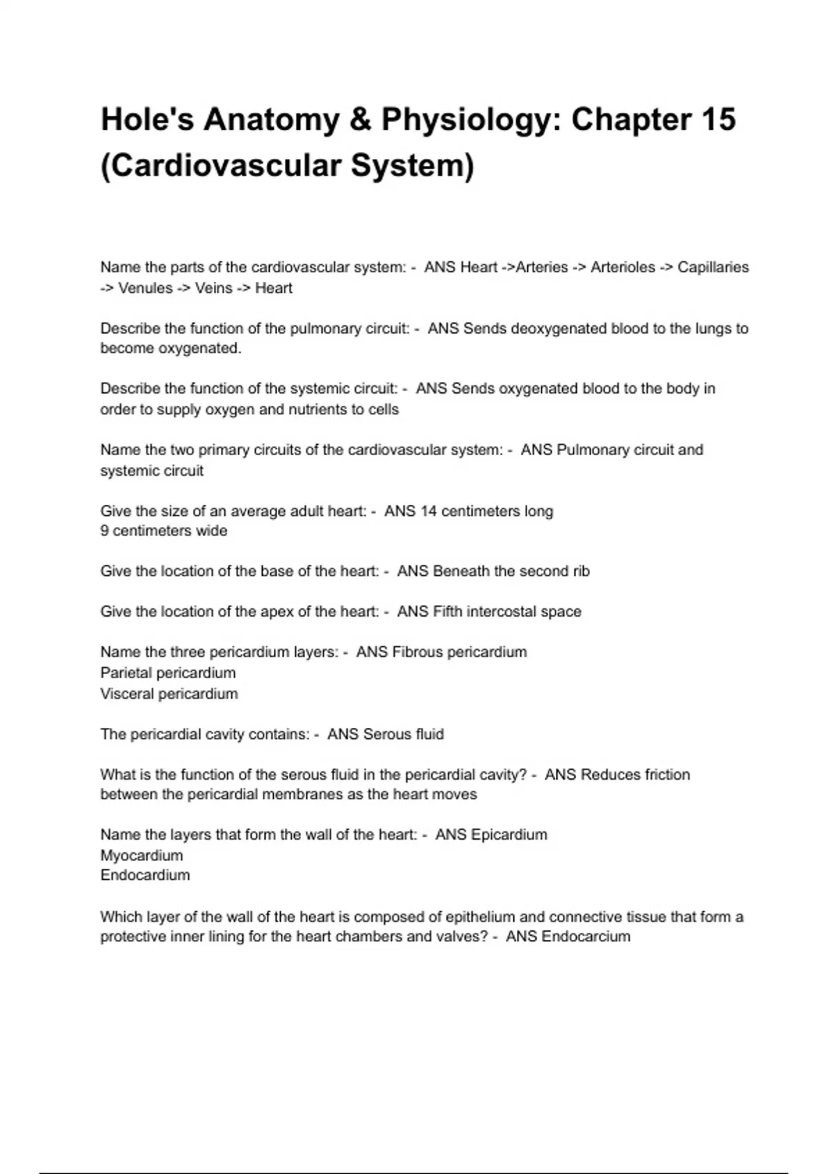This document is a comprehensive study guide for Chapter 15 of Hole’s Anatomy & Physiology, focusing on the cardiovascular system. It includes clear Q&A entries covering the heart's anatomy, the pulmonary and systemic circuits, cardiac cycle, heart sounds, conduction system, blood vessels, blood pressure, and related physiological concepts. Ideal for exam prep or review, it condenses essential chapter content into digestible answers.