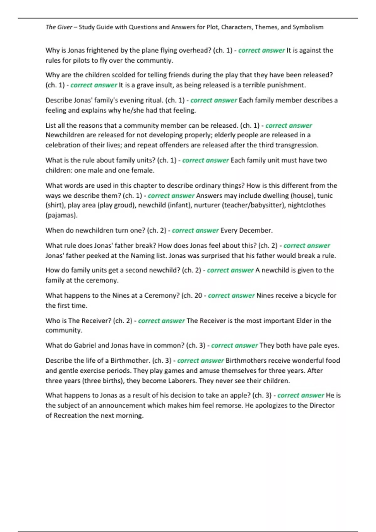 , The Giver – Study Guide with Questions and Answers for Plot, Characters, Themes, and Symbolism