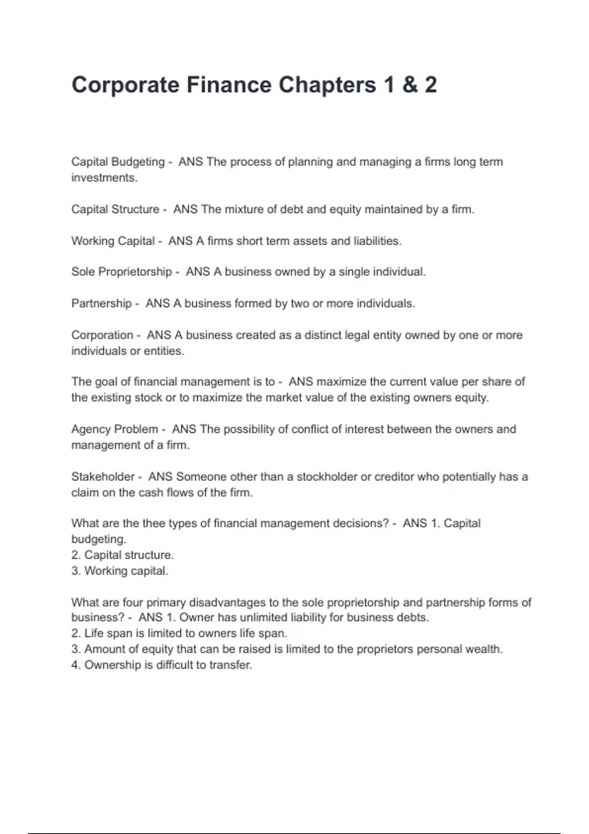 Corporate Finance Chapters 1 & 2