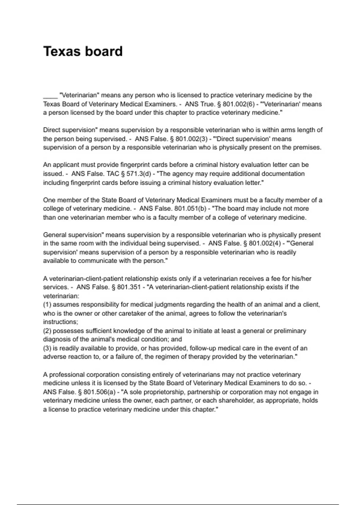 Texas Board of Veterinary Medical Examiners. - ANS True. § 801.002(6) - "'Veterinarian' means