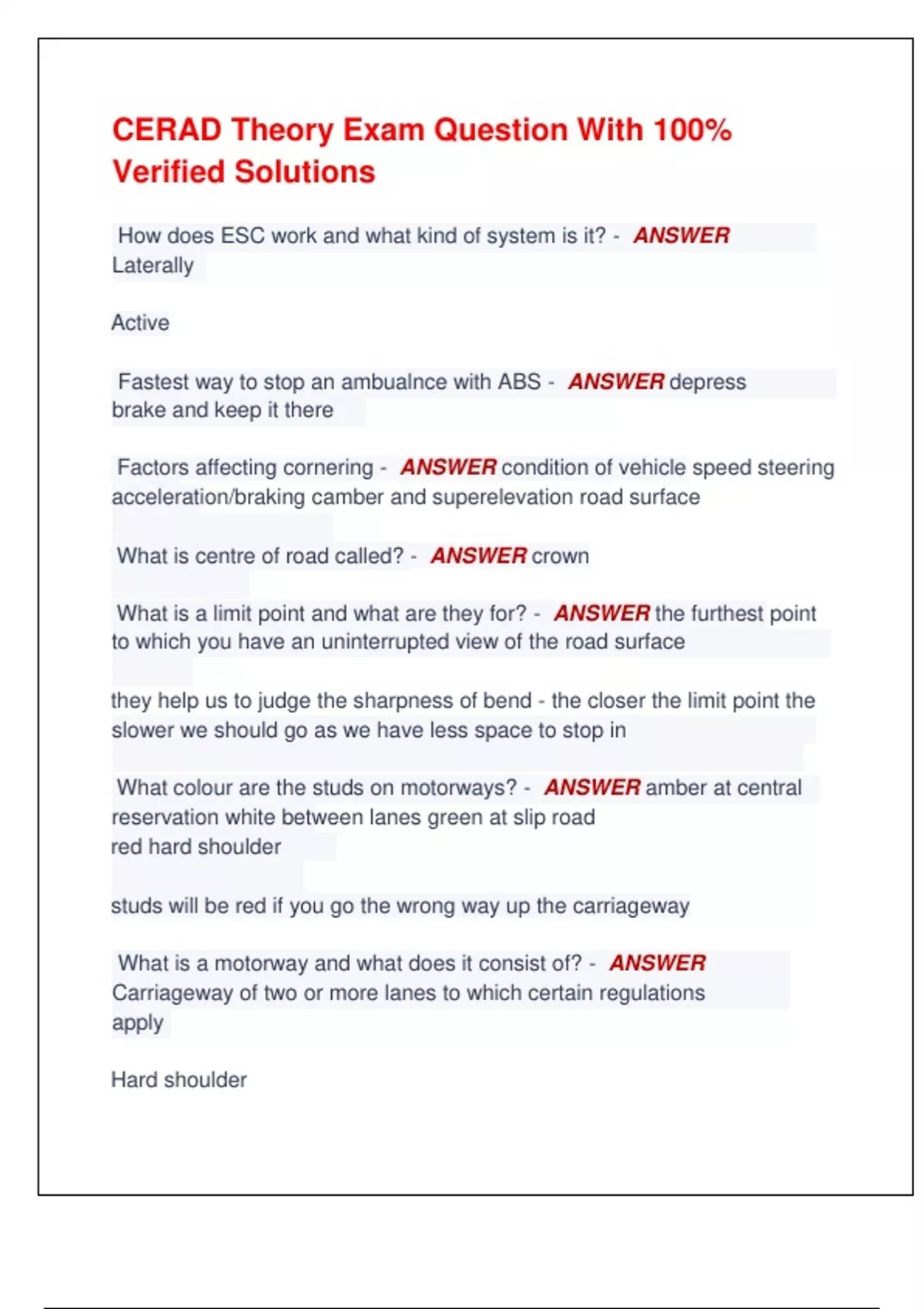 CERAD Theory Exam Question With 100% Verified Solutions How does ESC work and what kind of system is it? - ANSWER Laterally Active Fastest way to stop an ambualnce with ABS - ANSWER depress brake and keep it there Factors affecting cornering - ANSWER condition of vehicle speed steering acceleration/braking camber and superelevation road surface What is centre of road called? - ANSWER crown What is a limit point and what are they for? - ANSWER the furthest point to which you have an uninterrupted view of the road surface they help us to judge the sharpness of bend - the closer the limit point the slower we should go as we have less space to stop in What colour are the studs on motorways? - ANSWER amber at central reservation white between lanes green at slip road red hard shoulder studs will be red if you go the wrong way up the carriageway What is a motorway and what does it consist of? - ANSWER Carriageway of two or more lanes to which certain regulations apply Hard shoulder Central reservation Multiple lanes 3 ways to position vehicle at an RTC on motorway - ANSWER Fend off - send traffic to other lanes Fend in - send traffic towards hard shoulder In line - parking in line with RTC once police have arrived etc Blue light exemptions - ANSWER Speed Red lights as give ways Wrong side of keep left/right Nee naws between 11.30 and 07.00 Motorway regulations Stop in yellow box junction Use bus lane Enter pedestrian presinct What motorway regulations can be broken? (6) - ANSWER Direction Use of carriageway only Stopping Reversing Hard shoulder Use of central reservation Exemptions for ambulances with any category of patients - ANSWER Stopping on clearway Park on zig zag Park on double lines Park on offside Park on central reservation Lesve engine on when not in vehicle What is advisory speed limit on a motorway on blue lights? - ANSWER 90mph Park in bus stop Park in cycle lane Double park or park on dropped kerve 3 overtaking positions - ANSWER Following position Overtaking position Overtaking 3 types of tones - ANSWER Wail Yelp Machine gun Advisory speed limit in a 20 - ANSWER 30 Advisory speed limit in a 30 - ANSWER 45 4 rules of effective tones - ANSWER Tunes on Tones off Long tone (wail) Short tone (machine gun) When to use tones on - ANSWER To ask others to stop and give way When to use tones off - ANSWER To tell others to continue When to use long tones - ANSWER On approach to hazard When to use short tones - ANSWER Entering and negotiating hazards What is acceleration sense? - ANSWER Ability to vary speed with accelerator alone, meaning less use of braking