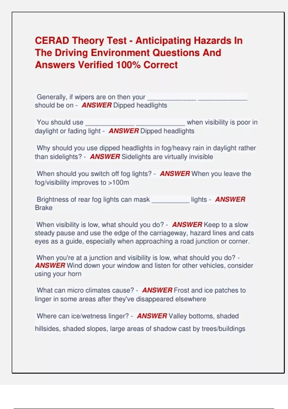 CERAD Theory Test - Anticipating Hazards In The Driving Environment Questions And Answers Verified 100% Correct Generally, if wipers are on then your _____________ _____________ should be on - ANSWER Dipped headlights You should use _____________ _____________ when visibility is poor in daylight or fading light - ANSWER Dipped headlights Why should you use dipped headlights in fog/heavy rain in daylight rather than sidelights? - ANSWER Sidelights are virtually invisible When should you switch off fog lights? - ANSWER When you leave the fog/visibility improves to >100m Brightness of rear fog lights can mask __________ lights - ANSWER Brake When visibility is low, what should you do? - ANSWER Keep to a slow steady pause and use the edge of the carriageway, hazard lines and cats eyes as a guide, especially when approaching a road junction or corner. When you're at a junction and visibility is low, what should you do? - ANSWER Wind down your window and listen for other vehicles, consider using your horn What can micro climates cause? - ANSWER Frost and ice patches to linger in some areas after they've disappeared elsewhere Where can ice/wetness linger? - ANSWER Valley bottoms, shaded hillsides, shaded slopes, large areas of shadow cast by trees/buildings What type of fog is particularly dangerous and a common cause of collisions? - ANSWER Patchy Surfaces that slope ____________ to the inside of the curve help cornering. - ANSWER Downwards Surfaces that slope _____________ to the inside of the curve make cornering more difficult - ANSWER Upwards If you can alter your road position and slow down to avoid potholes/manhole covers/sunken gullies/debris, then do so. If you can't, what should you do? - ANSWER Slow down to reduce shock and maintain stability as you pass over them Which road surfaces have good grip? - ANSWER Tarmac/asphalt, anti- skid surface, concrete Which road surfaces have poor grip when wet? - ANSWER Cobbles, brick paving, pavers, road paint, metal hazards on the road surface (tram lines, temporary metal sheeting, inspection covers) When would you be likely to see anti-skid surfaces? - ANSWER On approach to fixed hazards such as roundabouts, traffic lights and zebra crossings Rain increases the likelihood of skidding on which road surfaces? - ANSWER Cobbles, brick paving, pavers, road paint, metal hazards on the road surface (tram lines, temporary metal sheeting, inspection covers) Tyres travelling on ice make virtually no noise - true or false? - ANSWER True What can driving through water at speed cause? - ANSWER Can sharply deflect the front wheels and cause you to lose control If you decide to drive through water, how should you do it? - ANSWER Engage first gear and keep the engine running at just above idle speed (just enough to prevent stalling) In older vehicles, driving at higher revs through water could prevent water being drawn into the exhaust system. In many newer vehicles, the air intake is positioned below the front bumper so avoid higher revs as this could cause water to be sucked into the ____________ causing extensive damage - ANSWER Engine If just one wheel enters a deep puddle, what will happen? - ANSWER The wheel will slow rapidly, causing the vehicle to veer in that direction On road signs, the furthest hazard is shown at the ______________ and the nearest at the _______________ - ANSWER Bottom, top Where are diagonal white lines (hatched markings) bounded by broken white lines often used? - ANSWER - In the centre of the road to separate opposing flows of traffic - At junctions to protect traffic turning right - On the approach to a central traffic island or the start of a dual carriageway You should not enter any hatched area bounded by a broken line UNLESS... - ANSWER It is safe to do so What is OUR related to? - ANSWER Reading and using road signs/markings What does OUR stand for? - ANSWER Observe, Understand, React Collisions are disproportionately frequent on familiar roads - true or false? - ANSWER True Town driving puts heavy demands on your observation, reactions and driving skills, meaning that you need to be ___________ at all times - ANSWER Alert