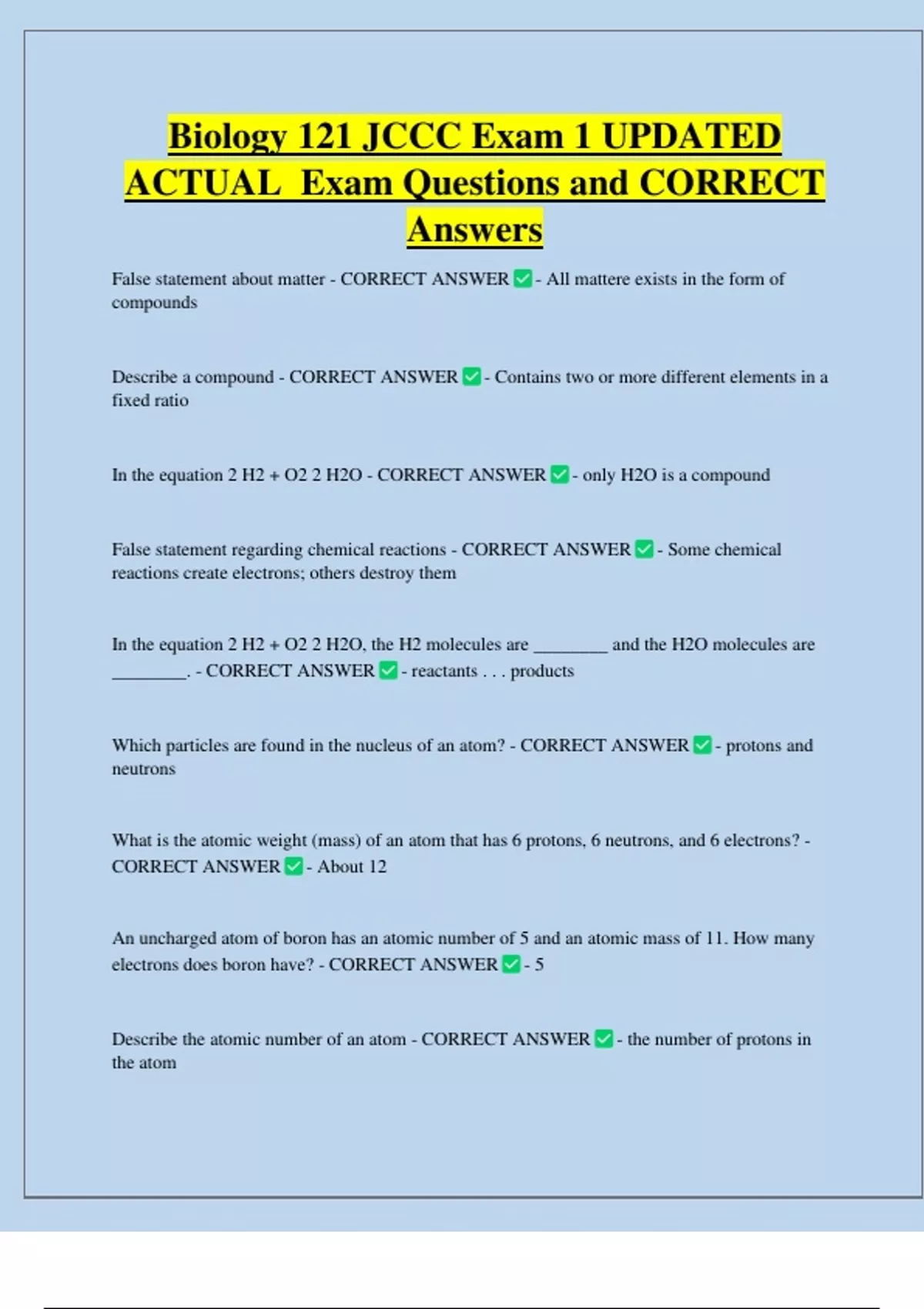 Biology 121 JCCC Exam 1 UPDATED ACTUAL Exam Questions and CORRECT Answers False statement about matter - CORRECT ANSWER - All mattere exists in the form of compounds Describe a compound - CORRECT ANSWER - Contains two or more different elements in a fixed ratio In the equation 2 H2 + O2 2 H2O - CORRECT ANSWER - only H2O is a compound False statement regarding chemical reactions - CORRECT ANSWER - Some chemic