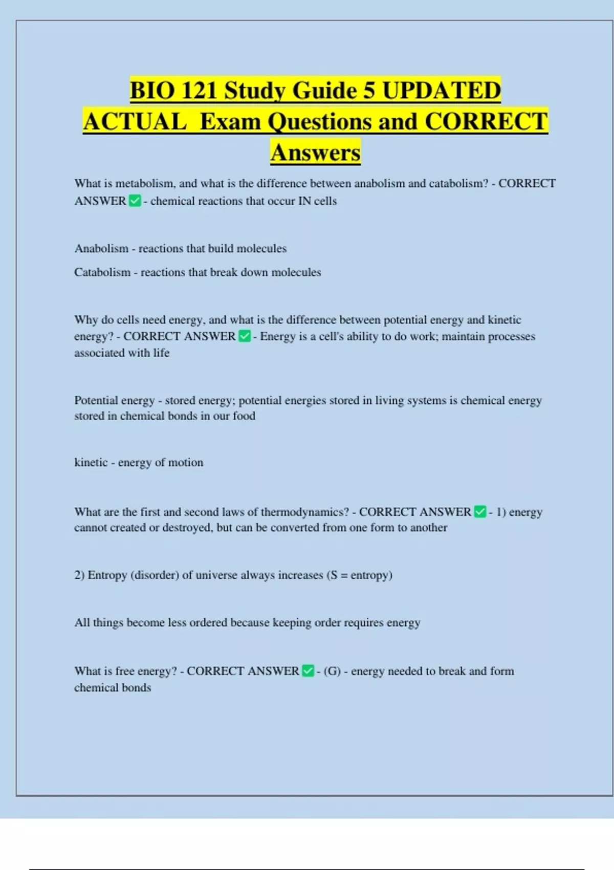 BIO 121 Study Guide 5 UPDATED ACTUAL Exam Questions and CORRECT Answers What is metabolism, and what is the difference between anabolism and catabolism? - CORRECT ANSWER - chemical reactions that occur IN cells Anabolism - reactions that build molecules Catabolism - reactions that break down molecules Why do cells need energy, and what is the difference between potential energy and kinetic energy? - CORRECT ANSWER - Energy is a cell's ability to do work; maintain processes