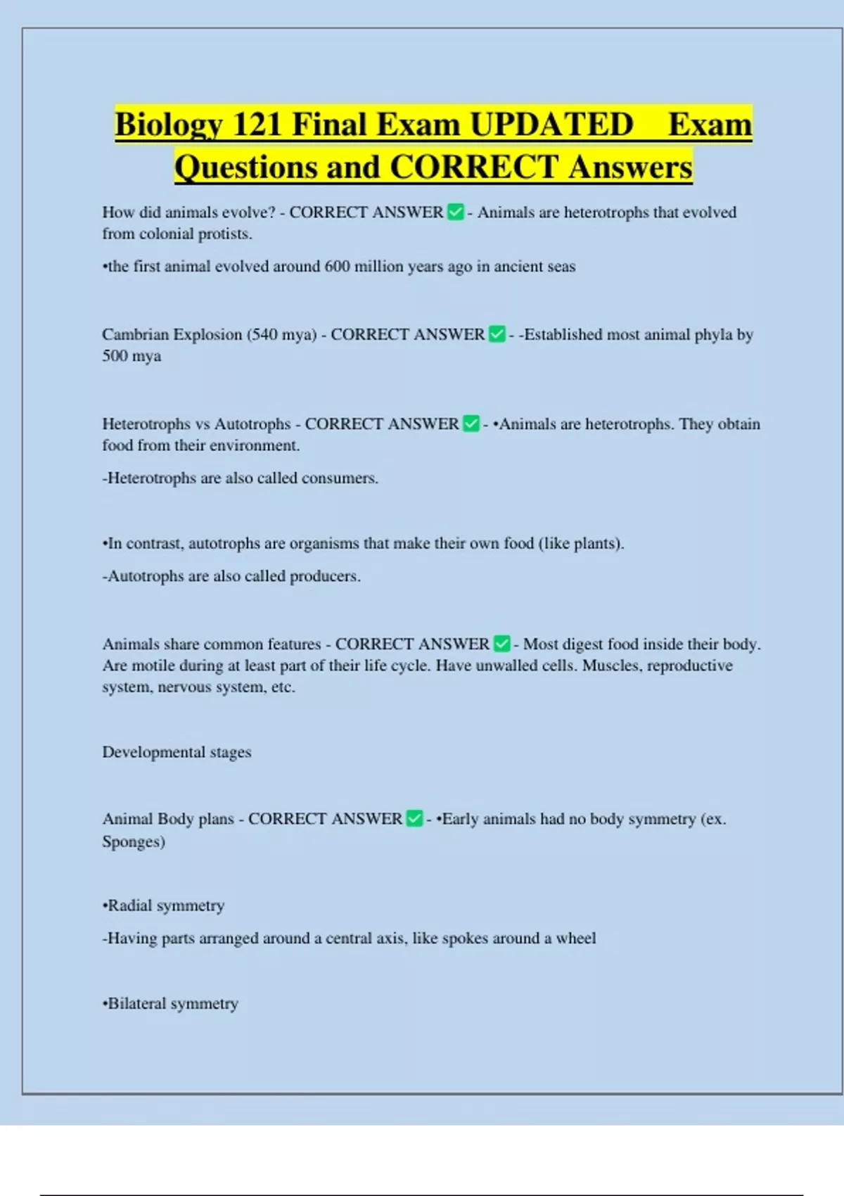 Biology 121 Final Exam UPDATED Exam Questions and CORRECT Answers How did animals evolve? - CORRECT ANSWER - Animals are heterotrophs that evolved from colonial protists. •the first animal evolved around 600 million years ago in ancient seas Cambrian Explosion (540 mya) - CORRECT ANSWER - -Established most animal phyla by 500 mya Heterotrophs vs Autotrophs - CORRECT ANSWER - •Animals are heterotrophs. They obtain food from their environment. -Heterotrophs are also called consumers. •In contrast, autotrophs are organisms that make their own food (like plants).