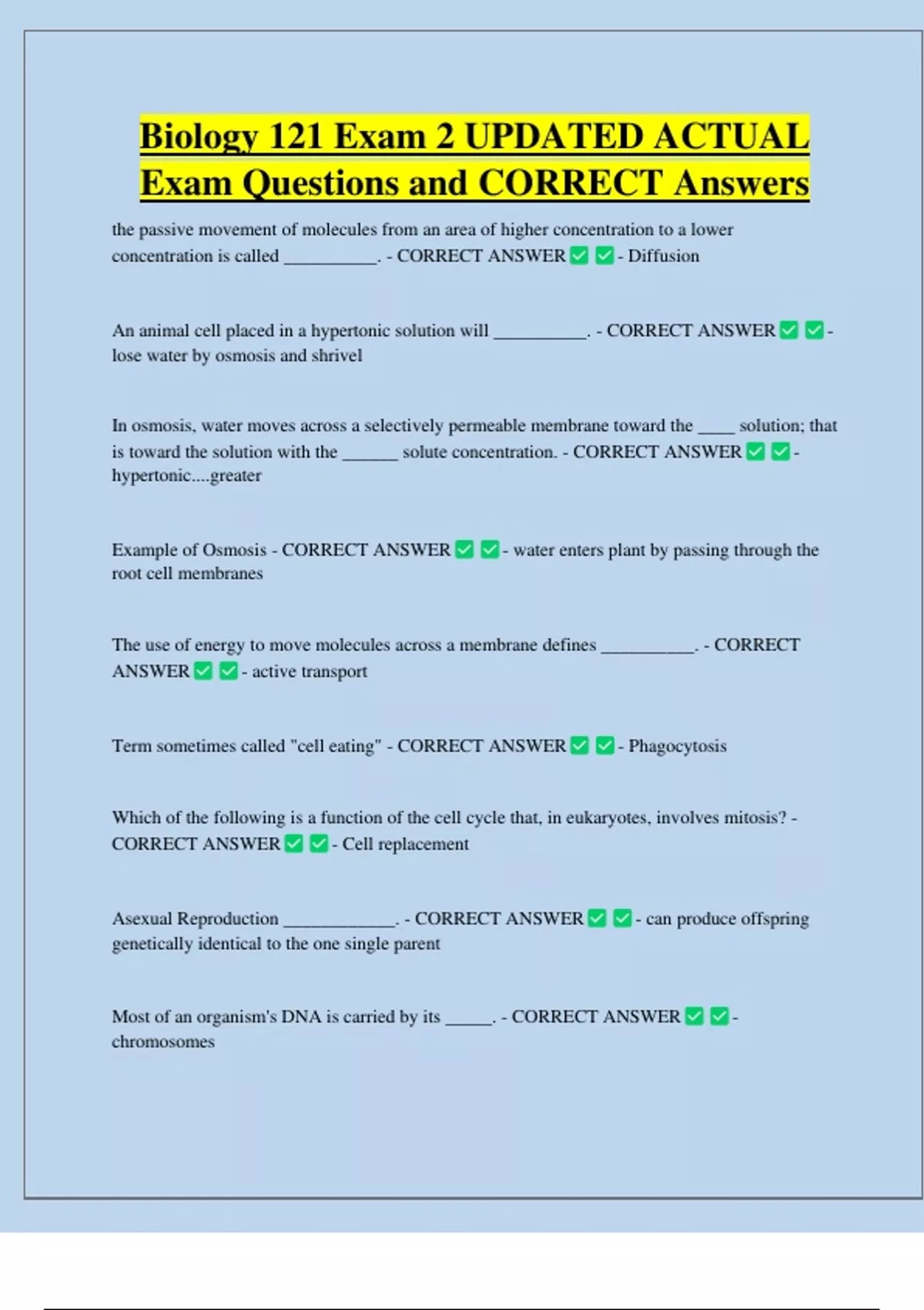 Biology 121 Exam 2 UPDATED ACTUAL Exam Questions and CORRECT Answers the passive movement of molecules from an area of higher concentration to a lower concentration is called __________. - CORRECT ANSWER - Diffusion An animal cell placed in a hypertonic solution will __________. - CORRECT ANSWER lose water by osmosis and shrivel - In osmosis, water moves across a selectively permeable membrane toward the ____ solution; that is toward the solution with the ______ solute concentration. - CORRECT ANSWER - hypertonic....greater