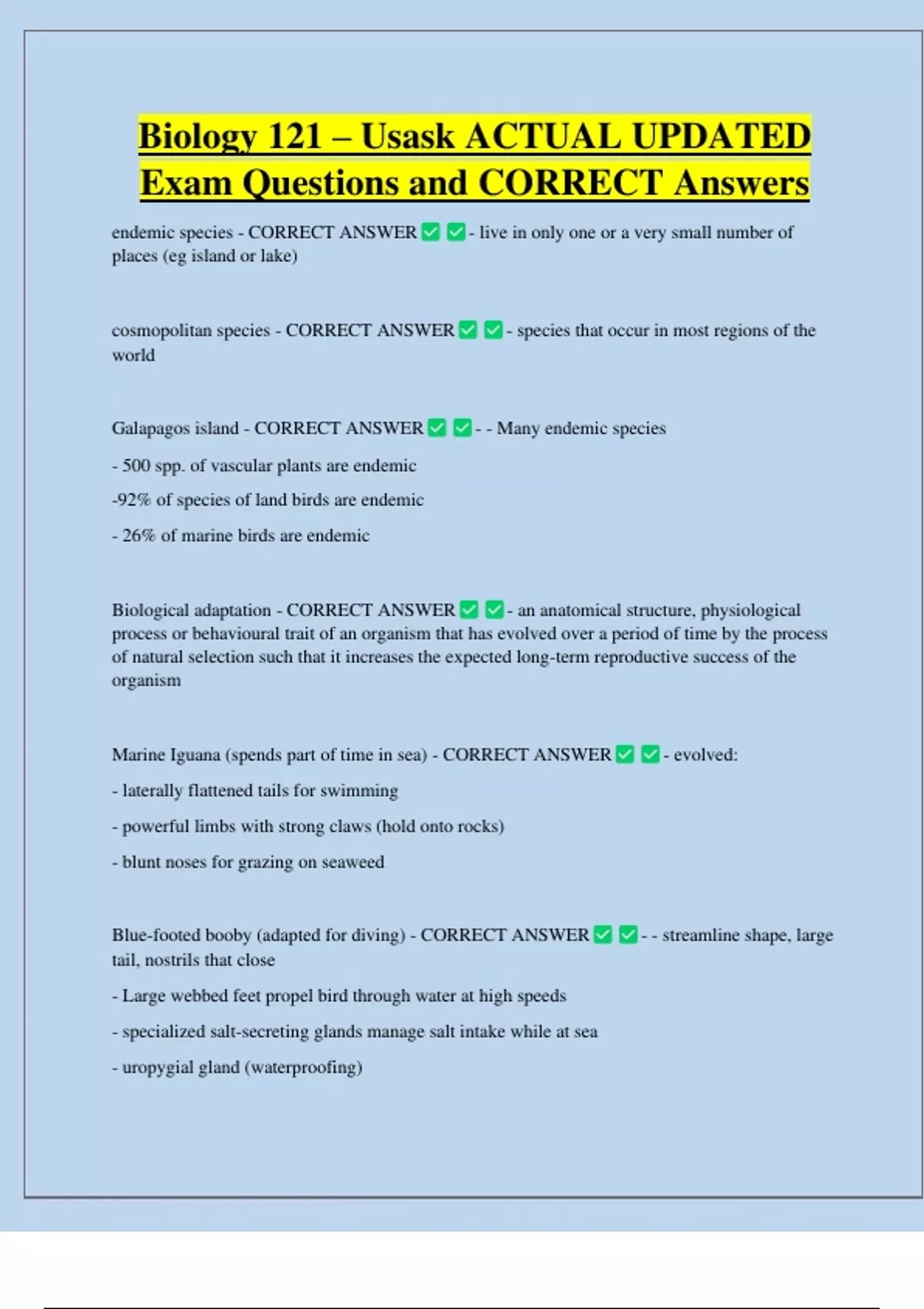 Biology 121 – Usask ACTUAL UPDATED Exam Questions and CORRECT Answers
