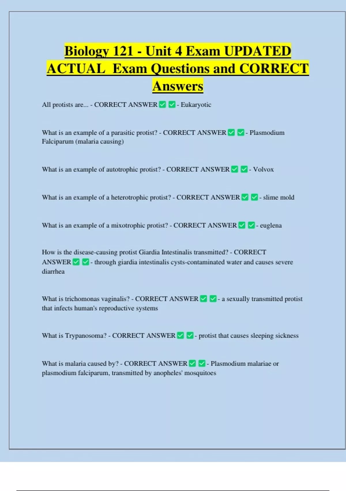 Biology 121 - Unit 4 Exam UPDATED ACTUAL Exam Questions and CORRECT Answers All protists are... - CORRECT ANSWER - Eukaryotic What is an example of a parasitic protist? - CORRECT ANSWER Falciparum (malaria causing) What is an example of autotrophic protist? - CORRECT ANSWER What is an example of a heterotrophic protist? - CORRECT ANSWER What is an example of a mixotrophic protist? - CORRECT ANSWER - Plasmodium - Volvox - slime mold