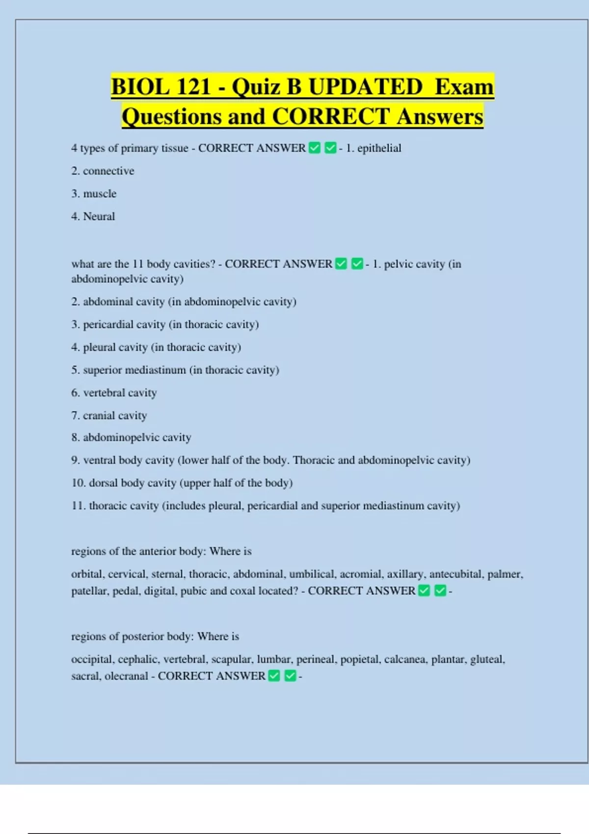 BIOL 121 - Quiz B UPDATED Exam Questions and CORRECT Answers 4 types of primary tissue - CORRECT ANSWER 2. connective 3. muscle 4. Neural what are the 11 body cavities? - CORRECT ANSWER abdominopelvic cavity) 2. abdominal cavity (in abdominopelvic cavity) 3. pericardial cavity (in thoracic cavity) 4. pleural cavity (in thoracic cavity) 5. superior mediastinum (in thoracic cavity) 6. vertebral cavity 7. cranial cavity 8. abdominopelvic cavity - 1. epithelial - 1. pelvic cavity (