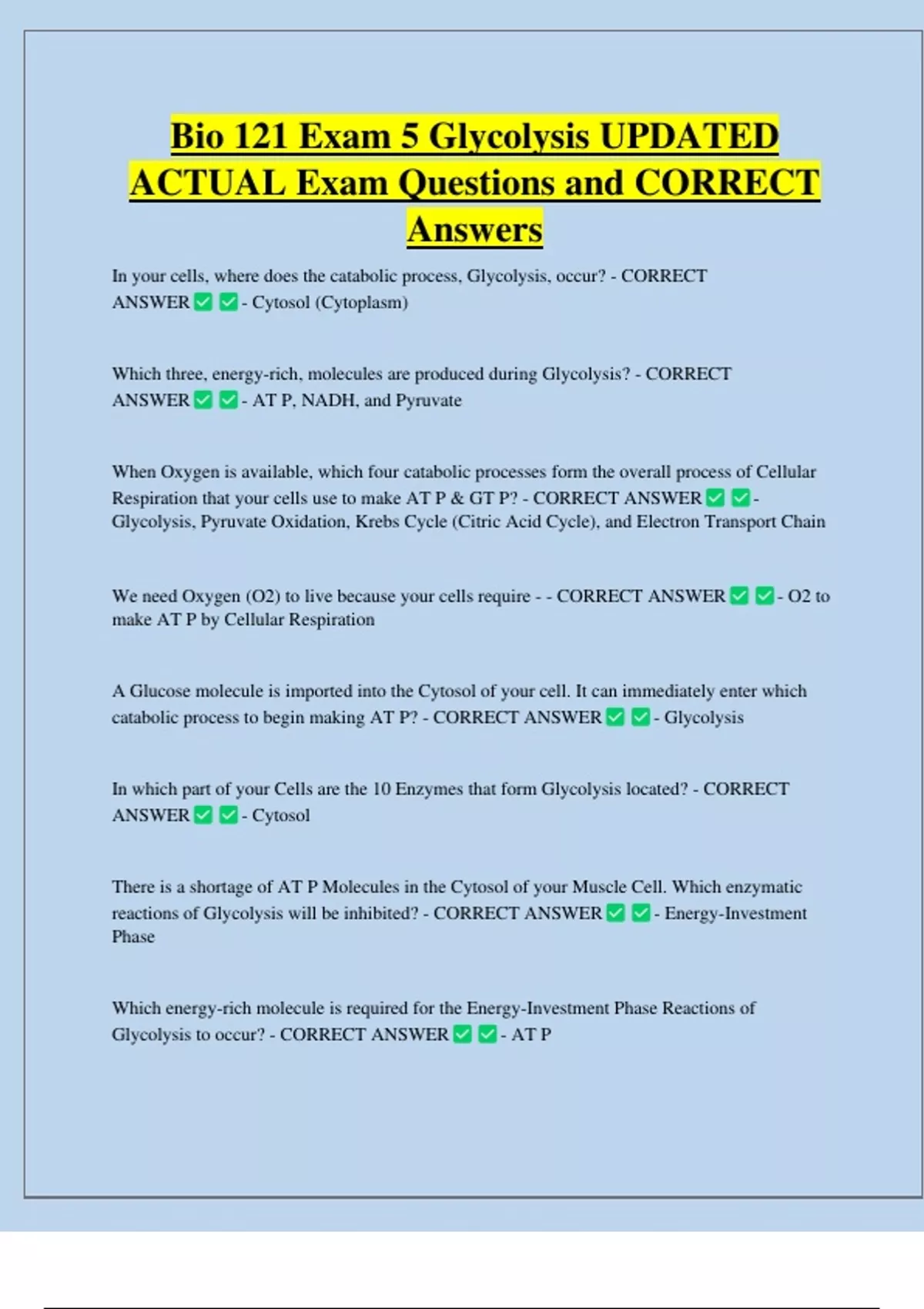 Bio 121 Exam 5 Glycolysis UPDATED ACTUAL Exam Questions and CORRECT Answers