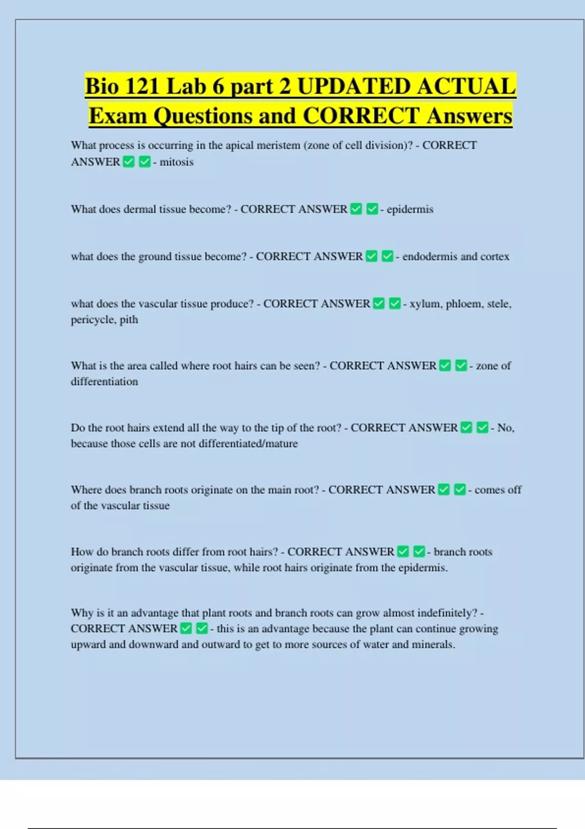 Bio 121 Lab 6 part 2 UPDATED ACTUAL Exam Questions and CORRECT Answers What process is occurring in the apical meristem (zone of cell division)? - CORRECT ANSWER - mitosis What does dermal tissue become? - CORRECT ANSWER what does the ground tissue become? - CORRECT ANSWER what does the vascular tissue produce? - CORRECT ANSWER pericycle, pith - epidermis - endodermis and cortex - xylum, phloem, ste
