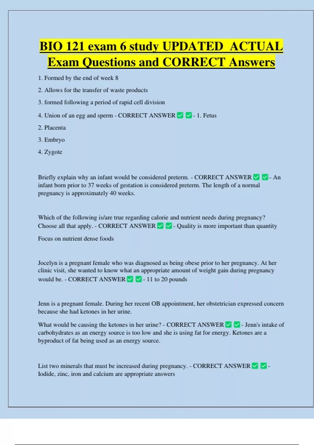 BIO 121 exam 6 study UPDATED ACTUAL Exam Questions and CORRECT Answers 1. Formed by the end of week 8 2. Allows for the transfer of waste products 3. formed following a period of rapid cell division 4. Union of an egg and sperm - CORRECT ANSWER 2. Placenta 3. Embryo 4. Zygote - 1. Fetus Briefly explain why an infant would be considered preterm. - CORRECT ANSWER infant born prior to 37 weeks of gestation is considered preterm. The length of a normal