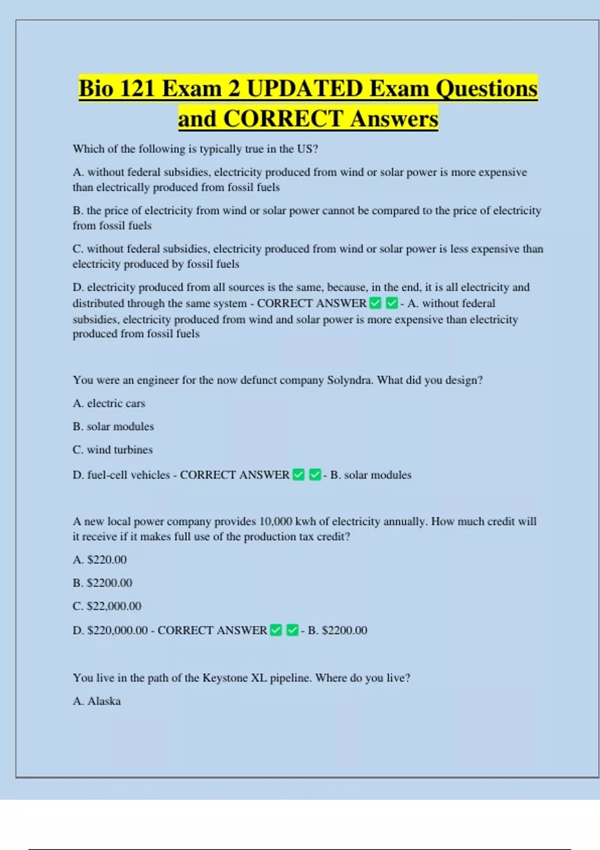 Bio 121 Exam 2 UPDATED Exam Questions and CORRECT Answers Which of the following is typically true in the US? A. without federal subsidies, electricity produced from wind or solar power is more expensive than electrically produced from fossil fuels B. the price of electricity from wind or solar power cannot be compared to the price of electricity from fossil fuels C. without federal subsidies, electricity produced from wind or solar power is less expensive than electricity produced by fossil fuels D. electricity produced from all sources is the same, because, in the end, it is all electricity and distributed through the same system - CORRECT ANSWER - A. without federal subsidies, electricity produced from wind and solar power is more expensive than electricity