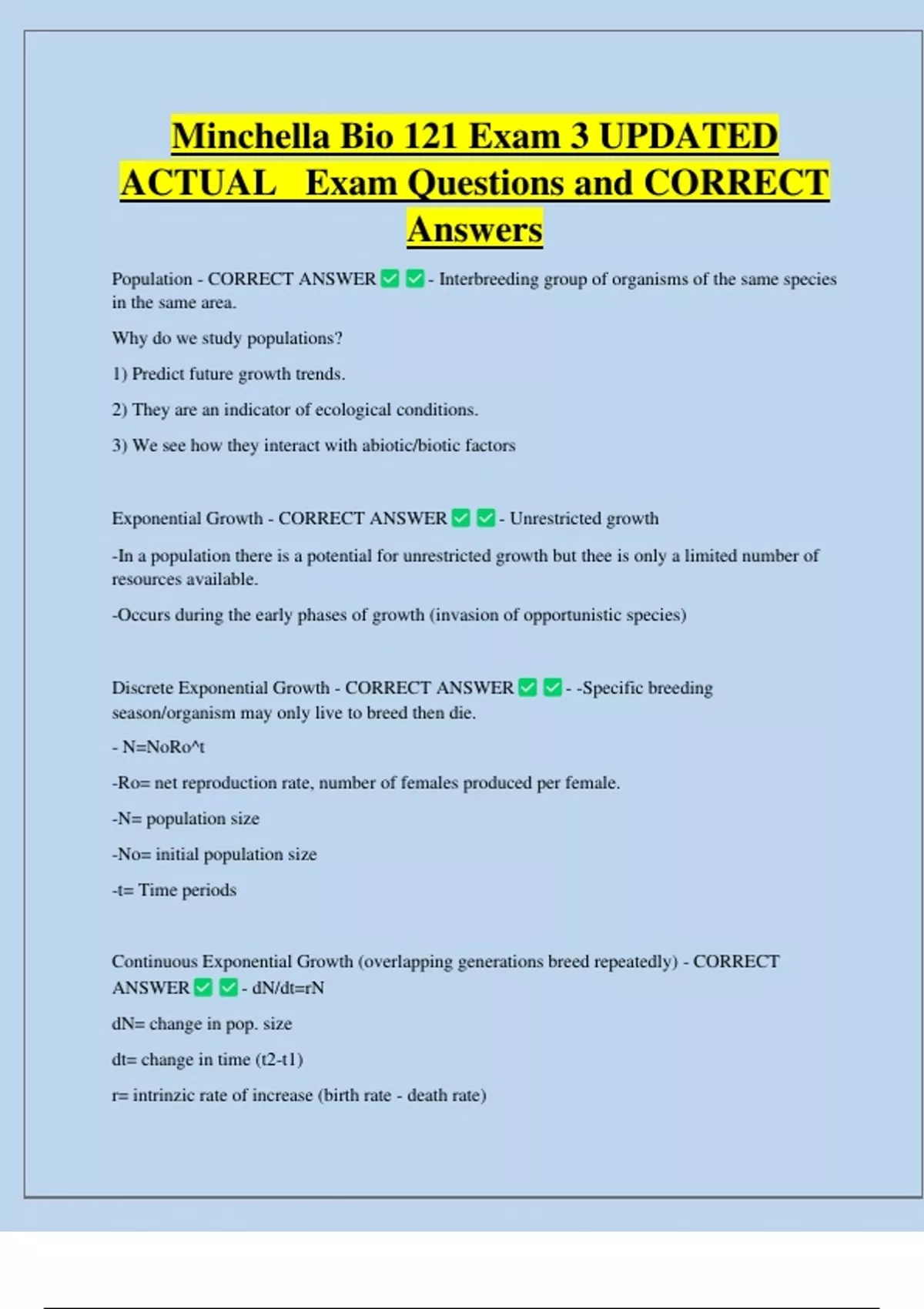 Minchella Bio 121 Exam 3 UPDATED ACTUAL Exam Questions and CORRECT Answers Population - CORRECT ANSWER in the same area. Why do we study populations? 1) Predict future growth trends. - Interbreeding group of organisms of the same species 2) They are an indicator of ecological conditions. 3) We see how they interact with abiotic/biotic factors Exponential Growth - CORRECT ANSWER - Unrestricted growth -In a population there is a potential for unrestricted growth but thee is only a limited number of