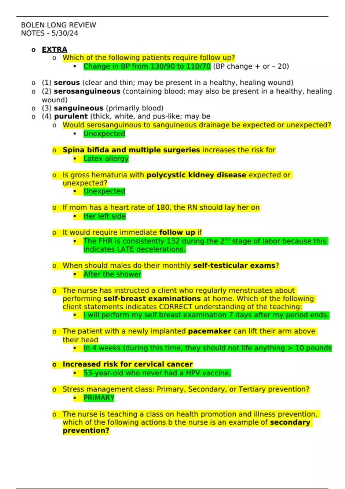BOLEN LONG REVIEW NOTES - 5/30/24 o EXTRA o Which of the following patients require follow up?  Change in BP from 130/90 to 110/70 (BP change + or – 20) o (1) serous (clear and thin; may be present in a healthy, healing wound) o (2) serosanguineous (containing blood; may also be present in a healthy, healing wound) o (3) sanguineous (primarily blood) o (4) purulent (thick, white, and pus-like; may be o Would serosanguinous to sanguineous drainage be expected or unexpected?  Unexpected o Spina bifida and multiple surgeries increases the risk for  Latex allergy o Is gross hematuria with polycystic kidney disease expected or unexpected?  Unexpected o If mom has a heart rate of 180, the RN should lay her on  Her left side o It would require immediate follow up if  The FHR is consistently 132 during the 2nd stage of labor because this indicates LATE decelerations. o When should males do their monthly self-testicular exams?  After the shower o The nurse has instructed a client who regularly menstruates about performing self-breast examinations at home. Which of the following client statements indicates CORRECT understanding of the teaching:  I will perform my self breast examination 7 days after my period ends. o The patient with a newly implanted pacemaker can lift their arm above their head  In 4 weeks (during this time, they should not life anything > 10 pounds o Increased risk for cervical cancer  53-year-old who never had a HPV vaccine. o Stress management class: Primary, Secondary, or Tertiary prevention?  PRIMARY o The nurse is teaching a class on health promotion and illness prevention, which of the following actions b the nurse is an example of secondary prevention?  Performing monthly self-breast examinations. o Posterior fontanel should close by  The 8th week o Anterior fontanel should close by  18 months o Which action is priority for the patient with Histrionic personality disorder?  Establish a TRUSTING relationship. o Teach patients to get a colonoscopy at age 50.  Then every 10 years o Postmortem care:  Check if patient is an ORGAN donor, leave dentures in for family to see the patient, place peri pads under the pt. o New admit hx of PUD. Initial assessment BP 110/70, P = 96; coffee ground emesis; Hgb 10.8 Priority?  Insert NG tube o Which action should be completed first for the patient with PUD and signs of excessive bleeding?  Draw type and CROSS for admin of PRBCs o The nurse is talking with a newly hired nurse about peritoneal dialysis and how to recognize peritonitis. Which signs and symptoms should the nurse include in the Discussion? 1, 2, 4, 5  Fever,  Rebound abdominal tenderness,  Nausea and vomiting,  Cloudy or opaque outflow o Follow up:  It would require further teaching if a stroke patient said they should NOT tilt their head FORWARD to swallow if they are experiencing dysphagia. VP Shunt ○ Position child on unoperated side to prevent pressure ○ Keep child flat to prevent rapid reduction ICP ■ ICP increase(change in LOC, restless, ICP ) → elevate HOB 15-30 degrees ○ Assess s/s infection, irritability, headache, lack of appetite ■ VP shunt next action? ● Raise the HOB to at least 30 degrees. ○ Float OB nurse ■ Give patient that is 24 hours post op appendectomy. ○ Low sodium diet ■ Grilled salmon with broccoli ○ It would require immediate follow up if the transplant patient. ■ has an increase in temper from 99.5 to 100.3 over 4 hours because this can be a sign of REJECTION. ○ Send to PCP ■ 65 year old with low HDL and high LDL ○ End stage renal disease: creatinine 2.7 is expected or unexpected? ■ Expected ○ Why would a pt have a high LDL level on a correct diet? ■ Genetics ○ The patient with atherosclerosis should avoid. ■ eggs ○ A nurse is working in a community health clinic is assessing clients who are waiting to be seen, which client should the nurse have the primary health care provider see FIRST? ■ A 57-year-old with Graves’ disease with a temperature of 100.5 ○ For the patient taking ACE inhibitors, what class of diuretics should be avoided? ■ Potassium sparing ○ Hypothyroid SATA: ■ Dry skin ■ Brittle nails ■ Menorrhagia ○ Which two meds should be given for cardiogenic shock? ■ Digoxin ■ Dobutamine ● Should fluids be given to the patient with cardiogenic shock? ○ NO! ○ Which fruit should be avoided when taking statins? ■ Grapefruit ○ The nurse is caring for a client who has been prescribed a statin to treat hyperlipidemia. Which should the nurse check? ■ Liver enzymes ○ In the early stages of cirrhosis, should the patient increase or decrease protein? ■ Increase protein. ○ In the late stages of cirrhosis, should the patient increase or decrease protein? ■ Decrease protein. ○ A nurse is working on a med surg unit has just received hand off report on the following clients, the nurse should FIRST plan to assess the client who has: ■ Acute pancreatitis and is reporting development of pain on inspiration. ○ The home health nurse is visiting a client who has emphysema. Which of the following client statements would reflect a correct understanding of managing self-care activities? ■ “I usually will not talk when I am doing other activities such as walking”. ○ A nurse is caring for a patient who has a triple lumen central venous catheter. Which of the following actions should the nurse take when accessing the catheter? ■ Flush NS with 10 ml syringe after each use. ○ A nurse is administering a soap suds enema to a client, the client reports abdominal cramping shortly after. What actions should the nurse take? ■ Lower the bag ○ Which electrolyte imbalance is associated with SIADH? ■ Hyponatremia ○ What can a pt with hyperthyroidism wear to alleviate discomfort and provide protection due to exophthalmos? ■ Wear an eye patch ○ If a child is regressing back to bedwetting during a time
