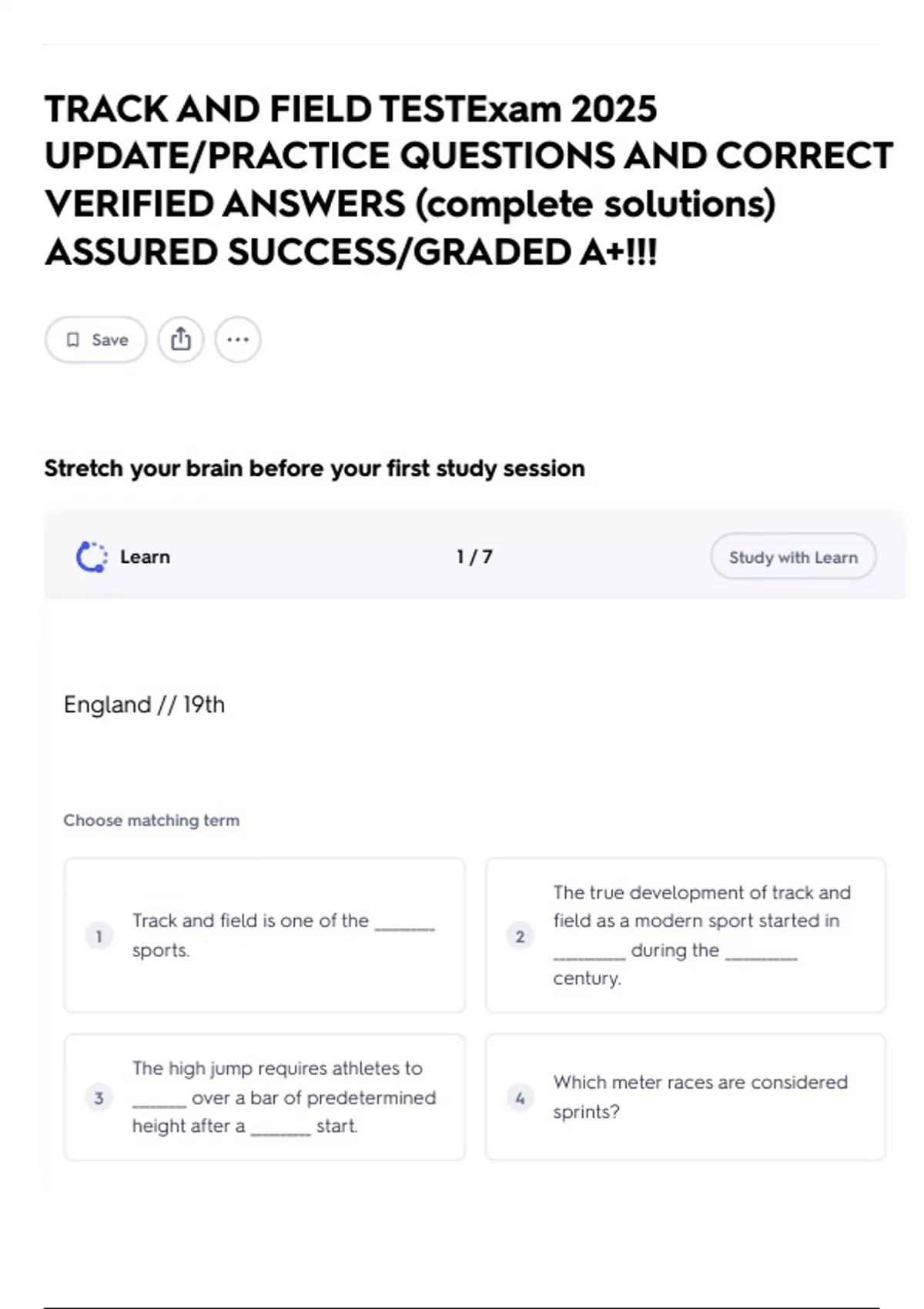 TRACK AND FIELD TESTExam 2025 UPDATE/PRACTICE QUESTIONS AND CORRECT VERIFIED ANSWERS (complete solutions) ASSURED SUCCESS/GRADED A+!!!