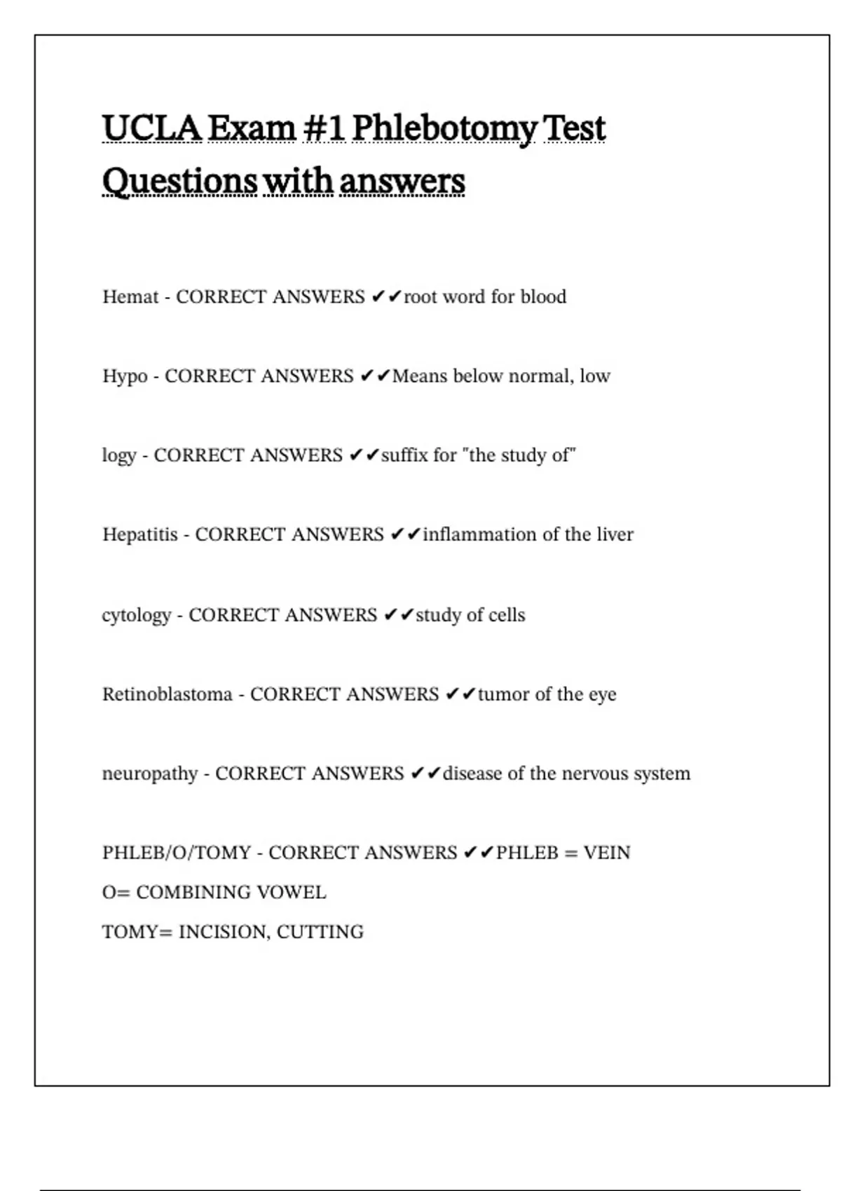 PHLEB/O/TOMY - CORRECT ANSWERS ✔✔PHLEB = VEIN || || || || || || ||