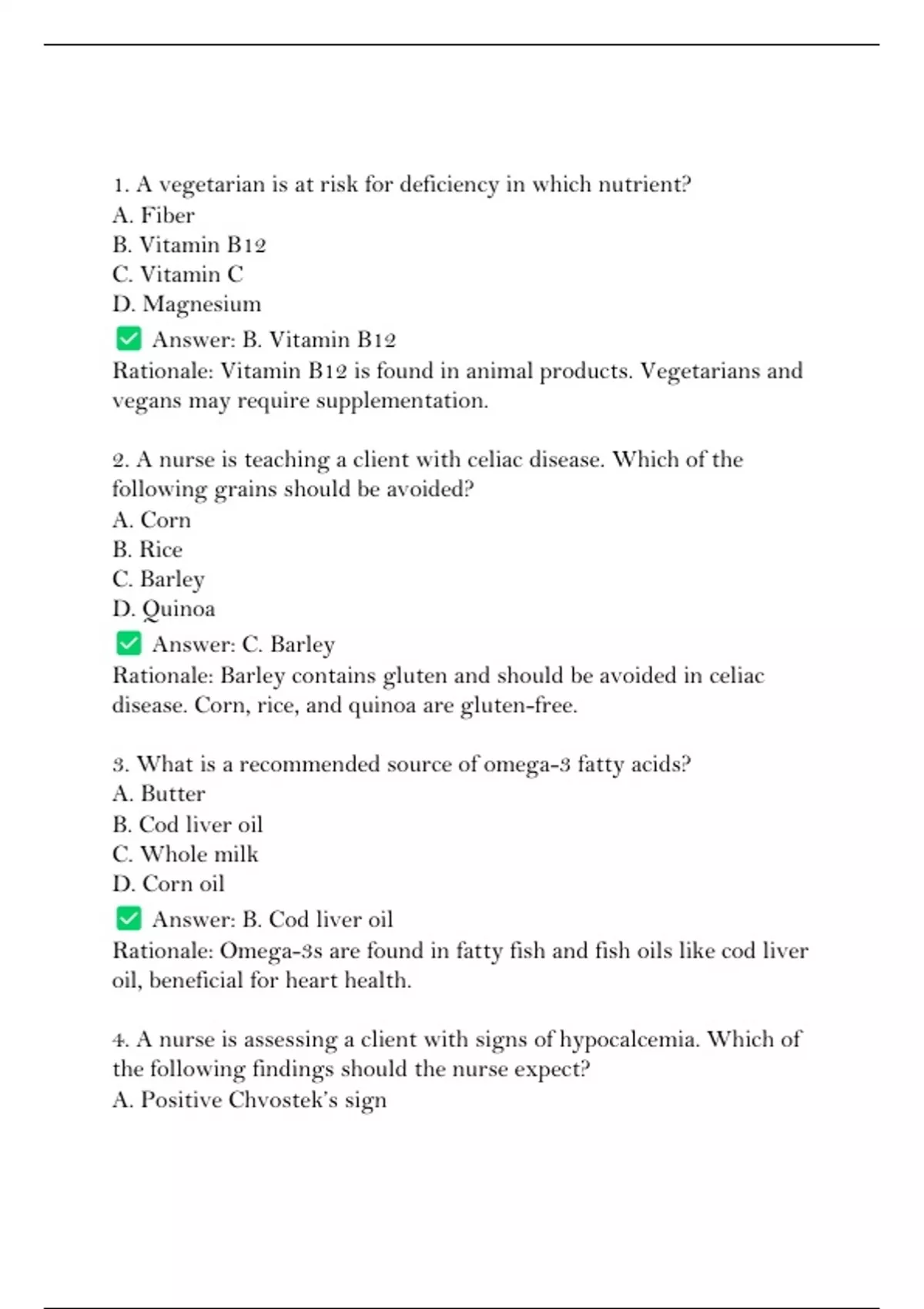 4. A nurse is assessing a client with signs of hypocalcemia. Which of