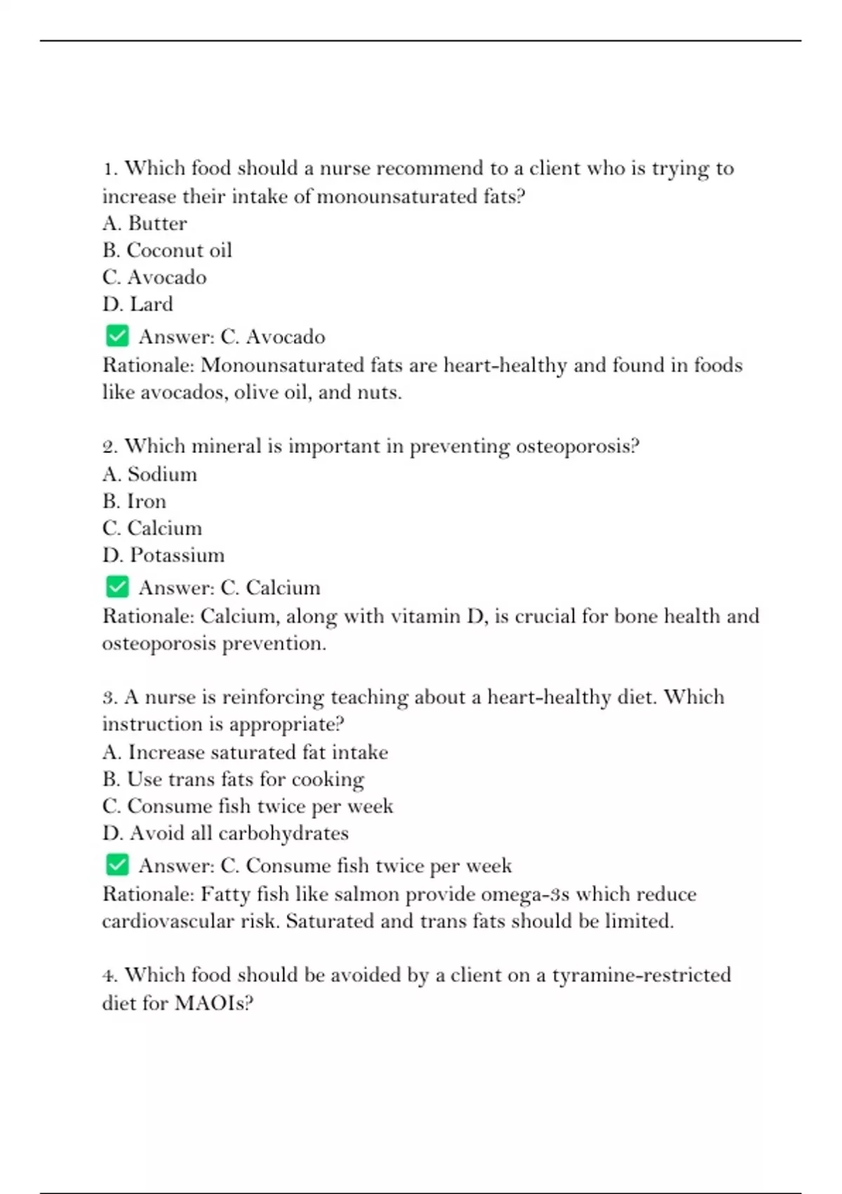 3. A nurse is reinforcing teaching about a heart-healthy diet. Which