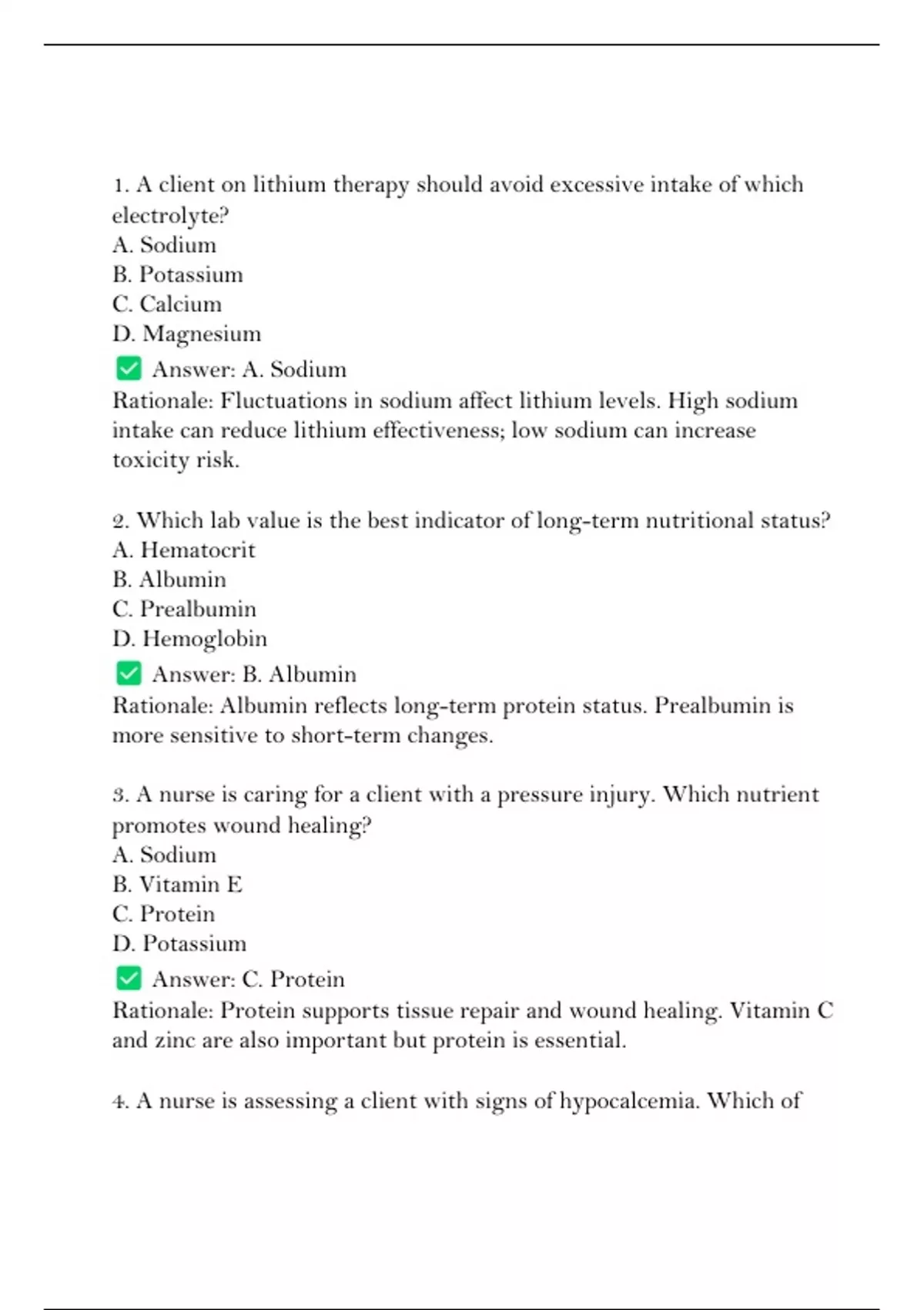 4. A nurse is assessing a client with signs of hypocalcemia. Which of