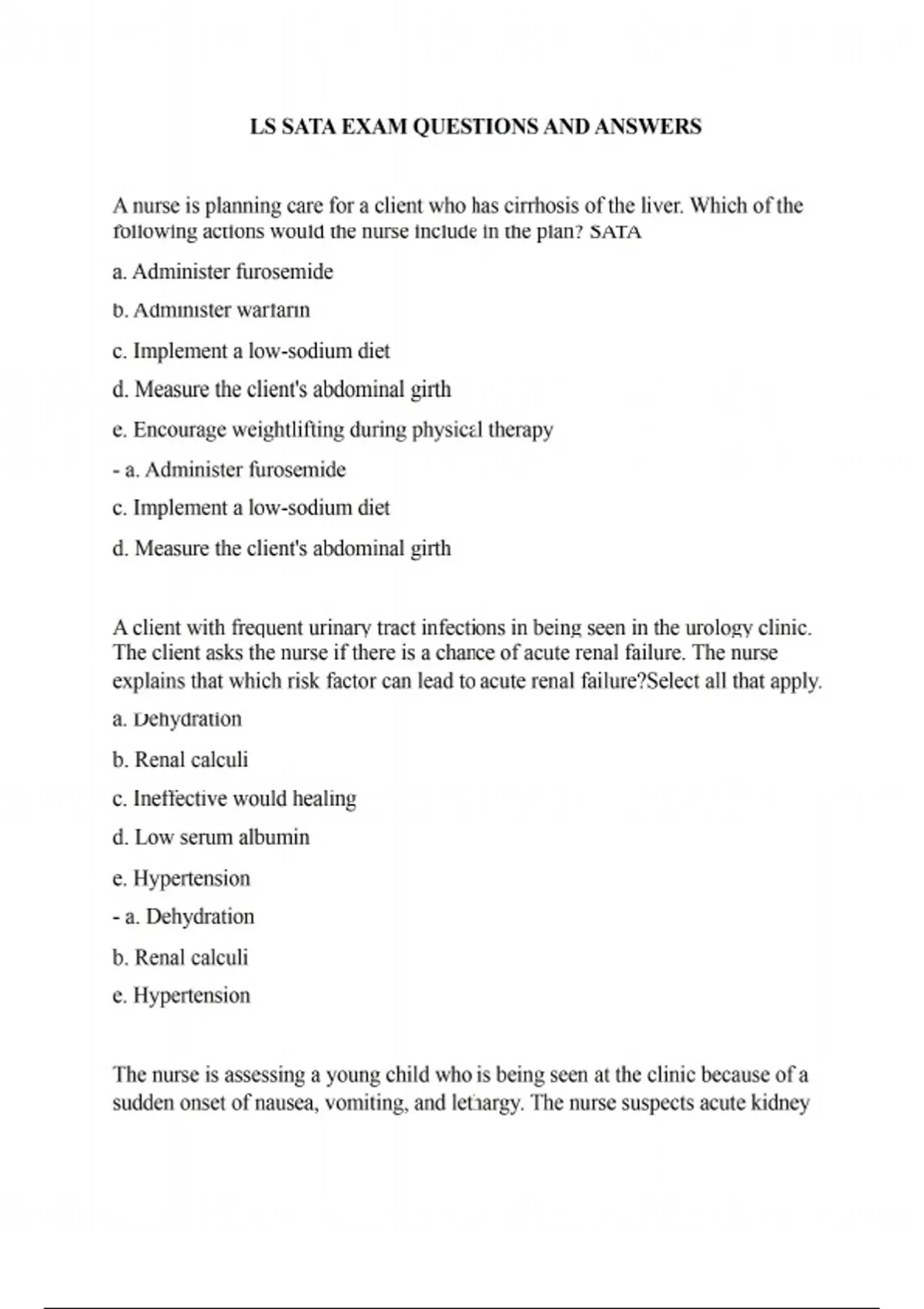 injury (AKI). Which clinical manifestations support the nurse's suspicions? SATASelect all that apply. a. Elevated blood pressure b. Postural hypotension c. Wheezing d. Edema e. Hematuria - a. Elevated blood pressure d. Edema e. Hematuria A client who was admitted with hyperglycemic-hyperosmolar state asks how he can prevent recurrence of this illness. The nurse would instruct the client about which prevention measures? a. Use sliding-scale insulin to cover periodic snacks b. Maintain fluid balance by drinking four glasses of water daily c. Monitor for signs of infection and treat infection early d. Consult the primary care provider when fasting blood glucose is elevated e. Use stress management techniques because stress increases blood glucose - c. Monitor for signs of infection and treat infection early e. Use stress management techniques because stress increases blood glucose A nurse assesses a client who has cirrhosis of the liver. Which laboratory findings would the nurse expect in clients with this disorder? Select all that apply a. Elevated international normalized ratio (INR) b. Decreased serum globulin levels c. Decreased serum alkaline phosphatase