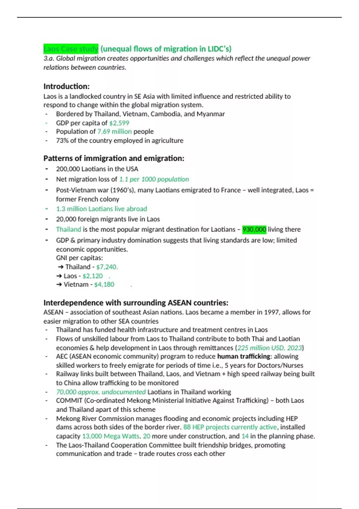 In depth case study notes for the OCR A-level Geography course, Paper two - Human interactions. This goes into detail about the third case study on the specification - 3.a. Global migration creates opportunities and challenges which reflect the unequal power relations between countries. Case study of one LIDC to show its limited influence (Laos PDR)