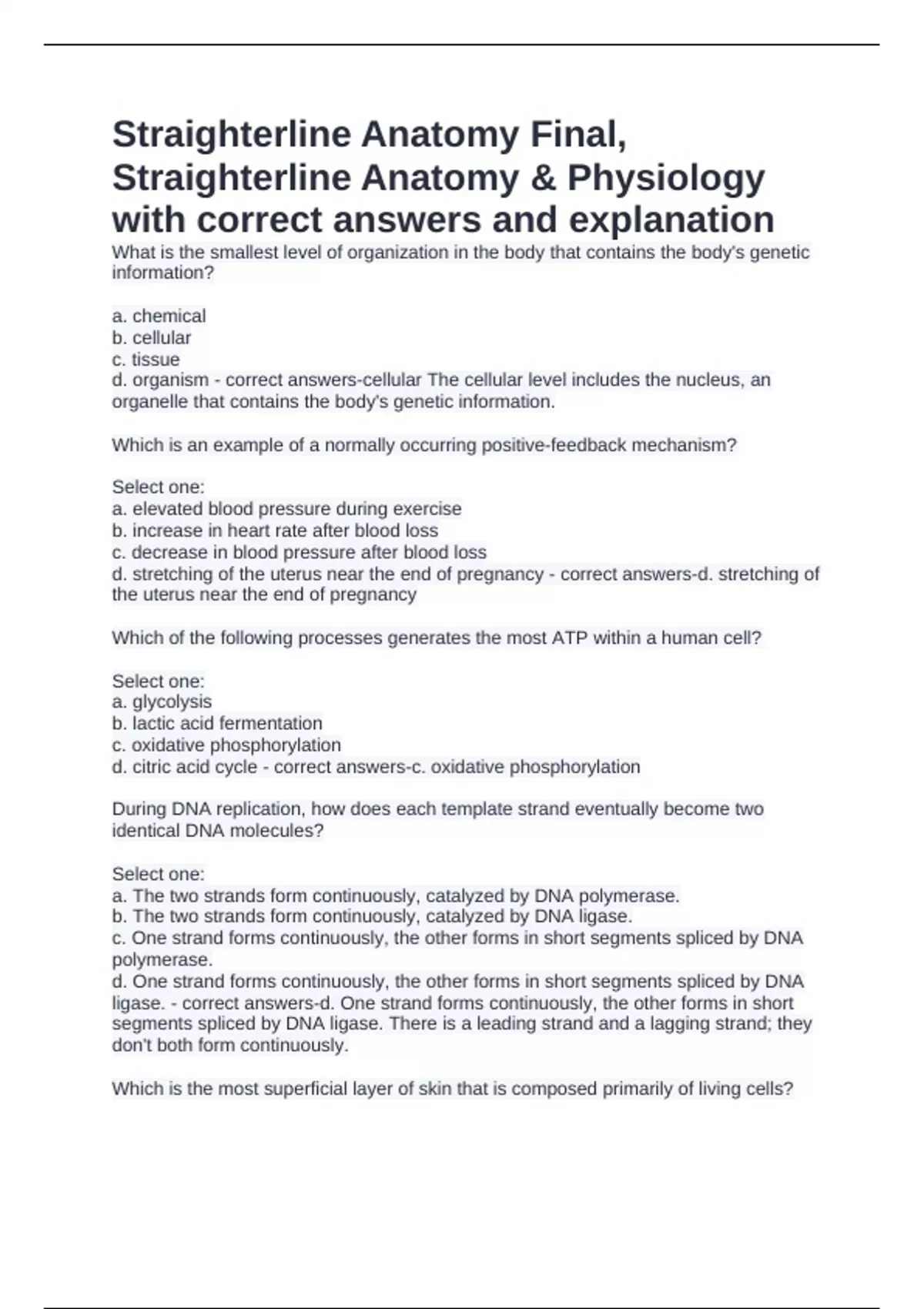 Straighterline Anatomy Final, Straighterline Anatomy & Physiology with correct answers and explanation What is the smallest level of organization in the body that contains the body's genetic information? a. chemical b. cellular c. tissue d. organism - correct answers-cellular The cellular level includes the nucleus, an organelle that contains the body's genetic information. Which is an example of a normally occurring positive-feedback mechanism? Select one: a. elevated blood pressure during exercise b. increase in heart rate after blood loss c. decrease in blood pressure after blood loss d. stretching of the uterus near the end of pregnancy - correct answers-d. stretching of the uterus near the end of pregnancy Which of the following processes generates the most ATP within a human cell? Select one: a. glycolysis b. lactic acid fermentation c. oxidative phosphorylation d. citric acid cycle - correct answers-c. oxidative phosphorylation During DNA replication, how does each template strand eventually become two identical DNA molecules? Select one: a. The two strands form continuously, catalyzed by DNA polymerase. b. The two strands form continuously, catalyzed by DNA ligase. c. One strand forms continuously, the other forms in short segments spliced by DNA polymerase. d. One strand forms continuously, the other forms in short segments spliced by DNA ligase. - correct answers-d. One strand forms continuously, the other forms in short segments spliced by DNA ligase. There is a leading strand and a lagging strand; they don't both form continuously. Which is the most superficial layer of skin that is composed primarily of living cells? Select one: a. stratum corneum b. stratum lucidum c. stratum basale spinosum. d. stratum spinosum - correct answers-. d. stratum spinosum (stratum basale layer is below the stratum spinosum) Which of the following is the definition of a third degree burn? Select one: a. a burn that covers at least 25% of the skin b. a burn that has destroyed the dermis and epidermis c. a burn that can only be caused by fire d. a burn that does not leave scars - correct answers-a burn that has destroyed the dermis and epidermis. How much skin the burn covers does not definite which degree of burn it is. Which of the following types of openings in the skeletal system does a "sinus" describe? Select one: a. cavity b. cleft c. hole d. tunnel - correct answers-a. cavity: a sinus is an air space within bone. Which of the following components of the bone matrix, when removed, allows the bone to be easily shattered? Select one: a. cartilage b. collagen c. hydroxyapatite d. mineral - correct answers-b. Collagen is a component of the bone matrix that gives it flexible strength so it is less brittle. Which of the following is the most widely distributed type of muscle in the body? Select one: a. cardiac b. postural c. skeletal d. smooth - correct answers-d. smooth