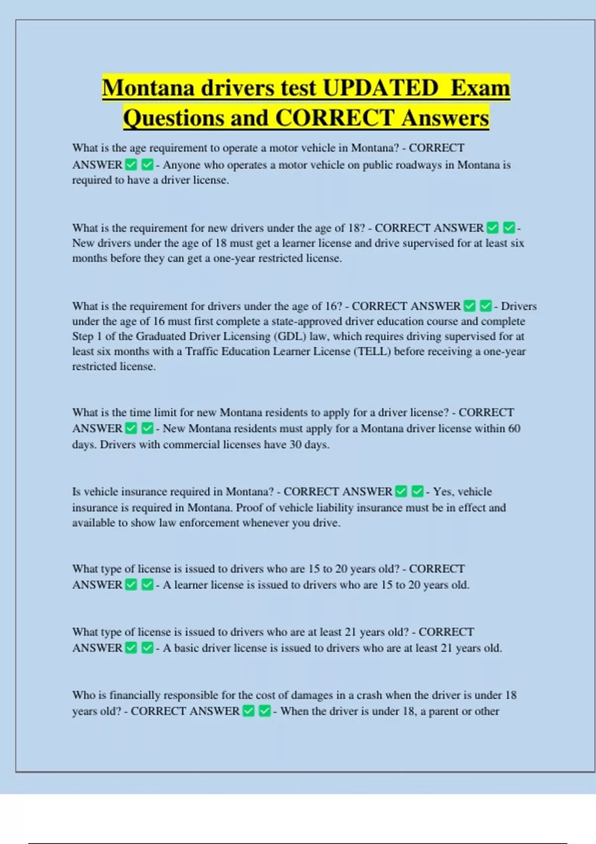 Montana drivers test UPDATED Exam Questions and CORRECT Answers What is the age requirement to operate a motor vehicle in Montana? - CORRECT ANSWER - Anyone who operates a motor vehicle on public roadways in Montana is required to have a driver license. What is the requirement for new drivers under the age of 18? - CORRECT ANSWER - New drivers under the age of 18 must get a learner license and drive supervised for at least six months before they can get a one-year restricted license. What is the requirement for drivers under the age of 16? - CORRECT ANSWER - Drivers under the age of 16 must first complete a state-approved driver education course and complete Step 1 of the Graduated Driver Licensing (GDL) law, which requires driving supervised for at least six months with a Traffic Education Learner License (TELL) before receivin