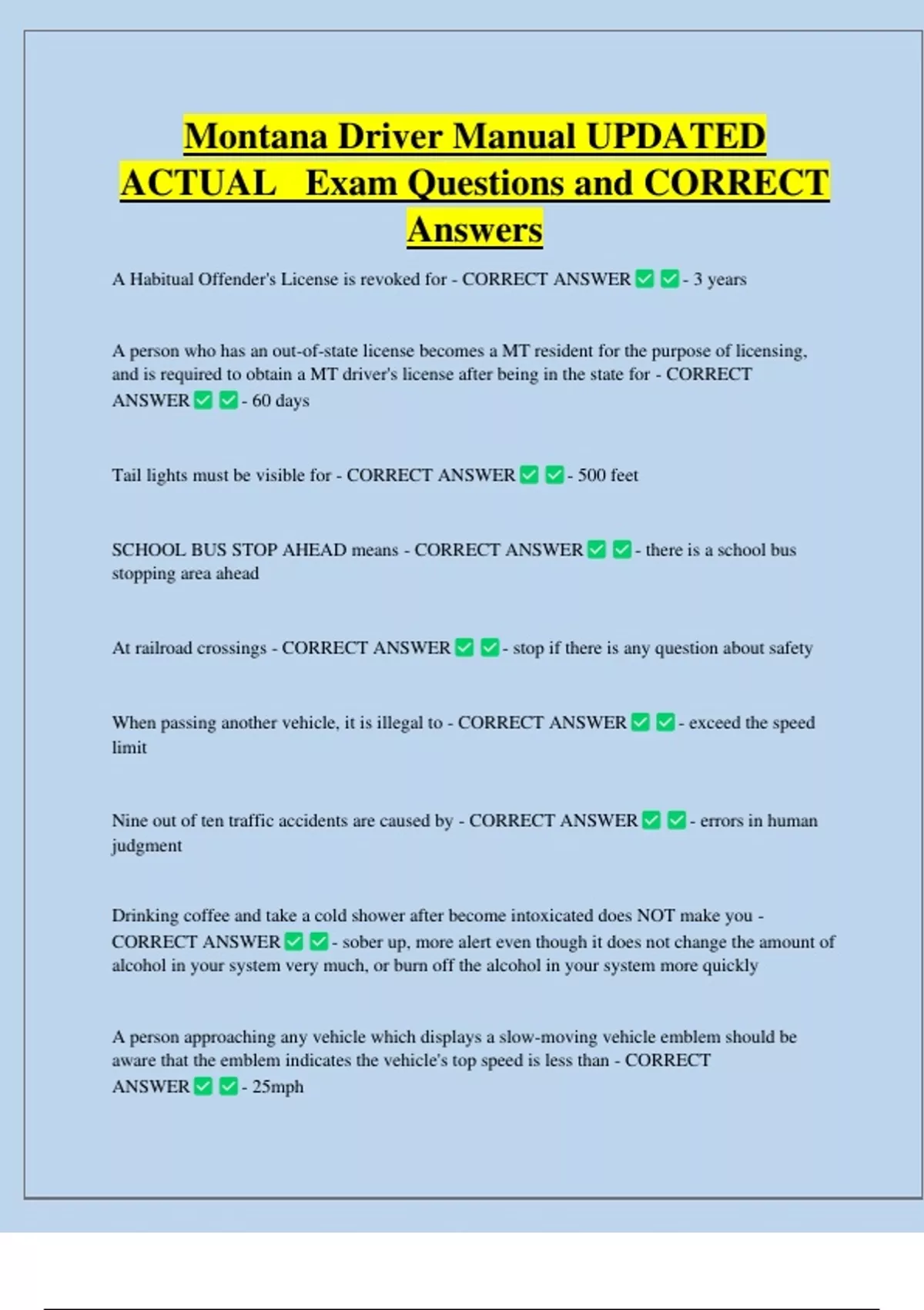 Montana Driver Manual UPDATED ACTUAL Exam Questions and CORRECT Answers