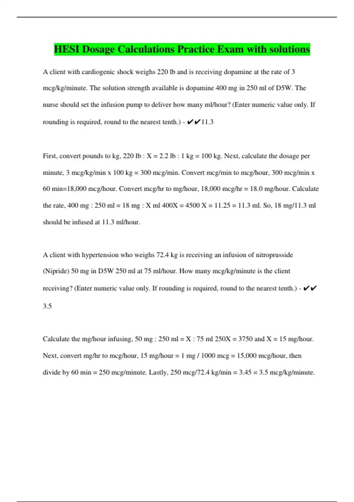 minute, 3 mcg/kg/min x 100 kg = 300 mcg/min. Convert mcg/min to mcg/hour, 300 mcg/min x