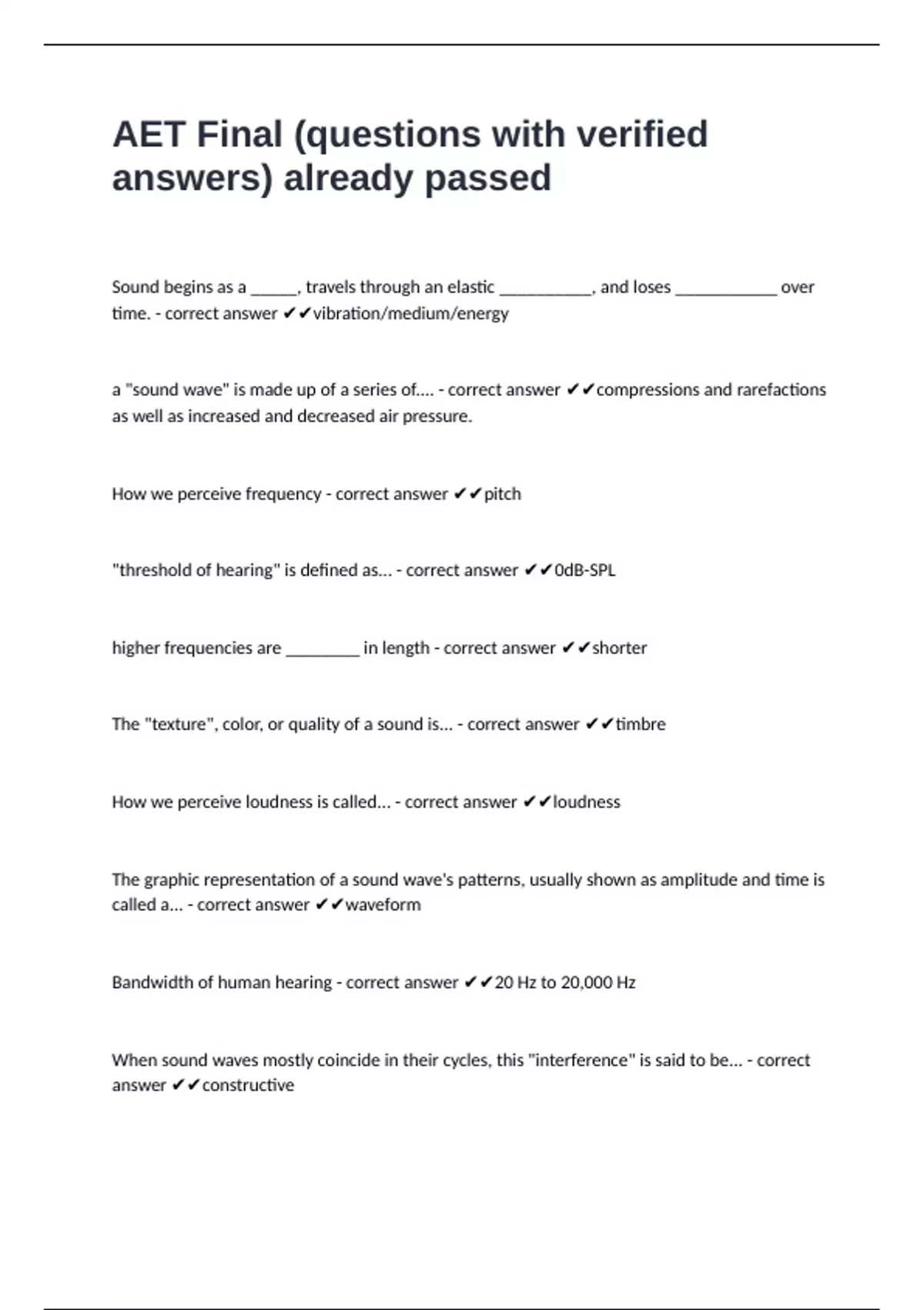 Bandwidth of human hearing - correct answer ✔✔20 Hz to 20,000 Hz