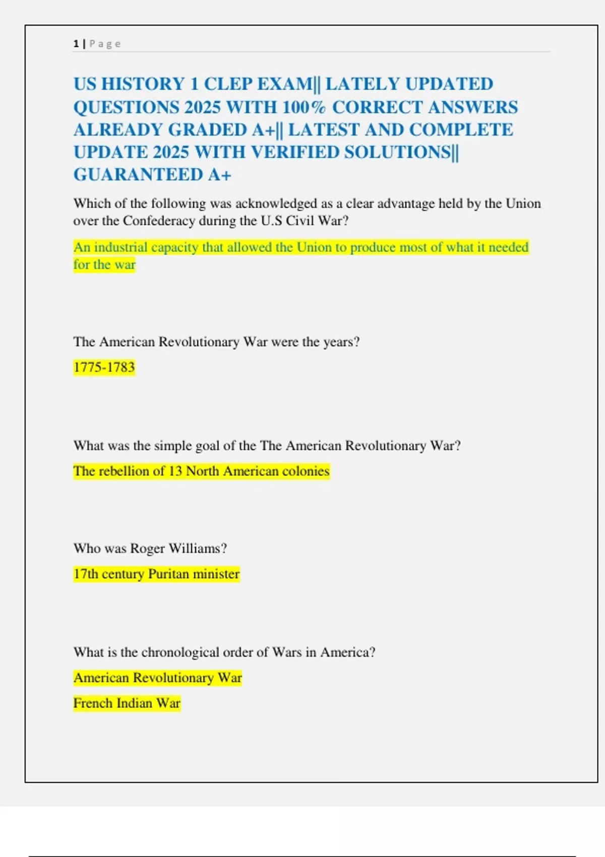 US HISTORY 1 CLEP EXAM|| LATELY UPDATED