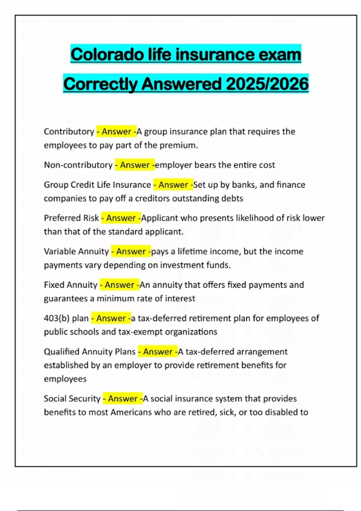 Colorado life insurance exam Correctly Answered 2025/2026 Contributory - Answer -A group insurance plan that requires the employees to pay part of the premium. Non-contributory - Answer -employer bears the entire cost Group Credit Life Insurance - Answer -Set up by banks, and finance companies to pay off a creditors outstanding debts Preferred Risk - Answer -Applicant who presents likelihood of risk lower than that of the standard applicant. Variable Annuity - Answer -pays a lifetime income, but the income payments vary depending on investment funds. Fixed Annuity - Answer -An annuity that offers fixed payments and guarantees a minimum rate of interest 403(b) plan - Answer -a tax-deferred retirement plan for employees of public schools and tax-exempt organizations Qualified Annuity Plans - Answer -A tax-deferred arrangement established by an employer to provide retirement benefits for employees Social Security - Answer -A social insurance system that provides benefits to most Americans who are retired, sick, or too disabled towork, and to families of workers who have died. AKA OASDHI. Funded by payroll taxes. The "blackout period" affects whose benefits? - Answer -surviving spouse Full Retirement Age (FRA) - Answer -The age at which full Social Security retirement benefits are payable Normal Retirement Age (NRA) - Answer -earliest age at which employees can retire and receive full