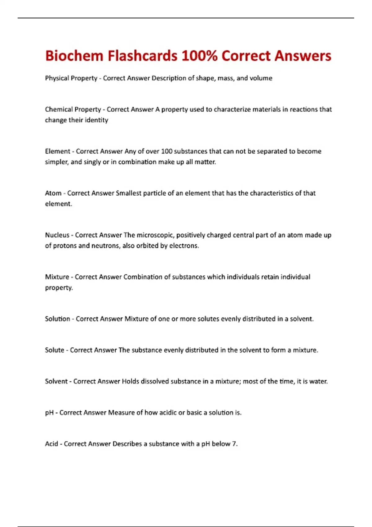 Biochem Flashcards 100% Correct Answers Physical Property - Correct Answer Description of shape, mass, and volume Chemical Property - Correct Answer A property used to characterize materials in reactions that change their identity Element - Correct Answer Any of over 100 substances that can not be separated to become simpler, and singly or in combination make up all matter. Atom - Correct Answer Smallest particle of an element that has the characteristics of that element. Nucleus - Correct Answer The microscopic, positively charged central part of an atom made up of protons and neutrons, also orbited by electrons. Mixture - Correct Answer Combination of substances which individuals retain individual property. Solution - Correct Answer Mixture of one or more solutes evenly distributed in a solvent. Solute - Correct Answer The substance evenly distributed in the solvent to form a mixture. Solvent - Correct Answer Holds dissolved substance in a mixture; most of the time, it is water. pH - Correct Answer Measure of how acidic or basic a solution is. Acid - Correct Answer Describes a substance with a pH below 7.