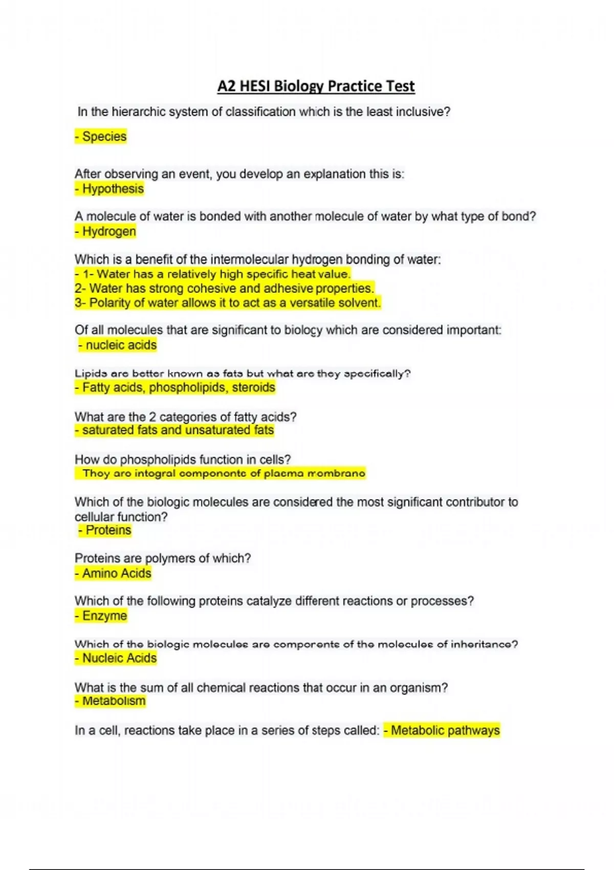 In the hierarchic system of classification which is the least inclusive? - Species After observing an event, you develop an explanation this is: - Hypothesis A molecule of water is bonded with another molecule of water by what type of bond? - Hydrogen Which is a benefit of the intermolecular hydrogen bonding of water: - 1- Water has a relatively high specific heat value. 2- Water has strong cohesive and adhesive properties. 3- Polarity of water allows it to act as a versatile solvent. Of all molecules that are significant to biology which are considered important: - nucleic acids Lipids are better known as fats but what are they specifically? - Fatty acids, phospholipids, steroids What are the 2 categories of fatty acids? - saturated fats and unsaturated fats How do phospholipids function in cells? - They are integral components of plasma membrane Which of the biologic molecules are considered the most significant contributor to cellular function? - Proteins Proteins are polymers of which? - Amino Acids Which of the following proteins catalyze different reactions or processes? - Enzyme Which of the biologic molecules are components of the molecules of inheritance? - Nucleic Acids What is the sum of all chemical reactions that occur in an organism? - Metabolism In a cell, reactions take place in a series of steps called: - Metabolic pathways What is the fundamental unit of biology? - Cell Which type of cell contains no defined nucleus? - Prokaryotic cell What is the primary purpose of the flagella on the surface of cells? - movement of the cell Which cell organelle functions to transport materials from the endoplasmic reticulum throughout the cell? - Golgi apparatus Which are the distant organelles that produce cell energy? - Mitochondrion and chloroplast Which component of the cell contributes to the protection, communication, and passage of substances into and out of the cell? - Cell Membrane The Cell Membrane consists of a bilayer of phospholipids which proteins, cholesterol, and glycoproteins. The bilayer creates a hydrophobic region between two layers of lipids, making it what: - Selectively permeable