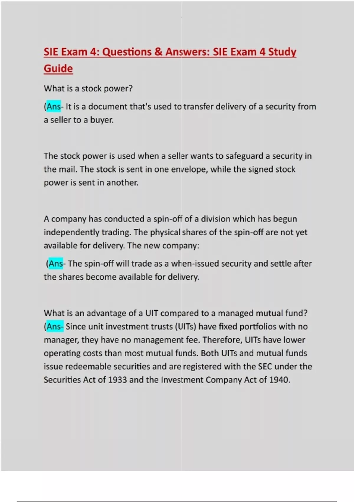 What is a stock power? (Ans- It is a document that's used to transfer delivery of a security from a seller to a buyer. The stock power is used when a seller wants to safeguard a security in the mail. The stock is sent in one envelope, while the signed stock power is sent in another. A company has conducted a spin-off of a division which has begun independently trading. The physical shares of the spin-off are not yet available for delivery. The new company: (Ans- The spin-off will trade as a when-issued security and settle after the shares become available for delivery. What is an advantage of a UIT compared to a managed mutual fund? (Ans- Since unit investment trusts (UITs) have fixed portfolios with no manager, they have no management fee. Therefore, UITs have lower operating costs than most mutual funds. Both UITs and mutual funds issue redeemable securities and are registered with the SEC under the Securities Act of 1933 and the Investment Company Act of 1940.Philip is considering the use of sector rotation as a strategy for his portfolio. Which of the following statements best describes how Philip's portfolio would be managed after implementation of this strategy? (Ans- Shifting investments from one business sector to another is known as sector rotation. As the economic cycle changes, different business sectors will be affected. Some sectors will outperform, based on the change in economic activity, while others will not. The strategy is used to attempt to profit through timing from a particular economic cycle. Based on the reading of the economy and its future direction, a portfolio will be shifted into different sectors in anticipation of a particular sector outperforming the others at that point in the business cycle