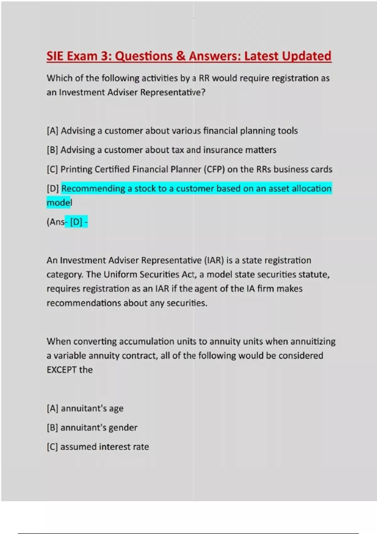 SIE Exam 3: Questions & Answers: Latest Updated Solution