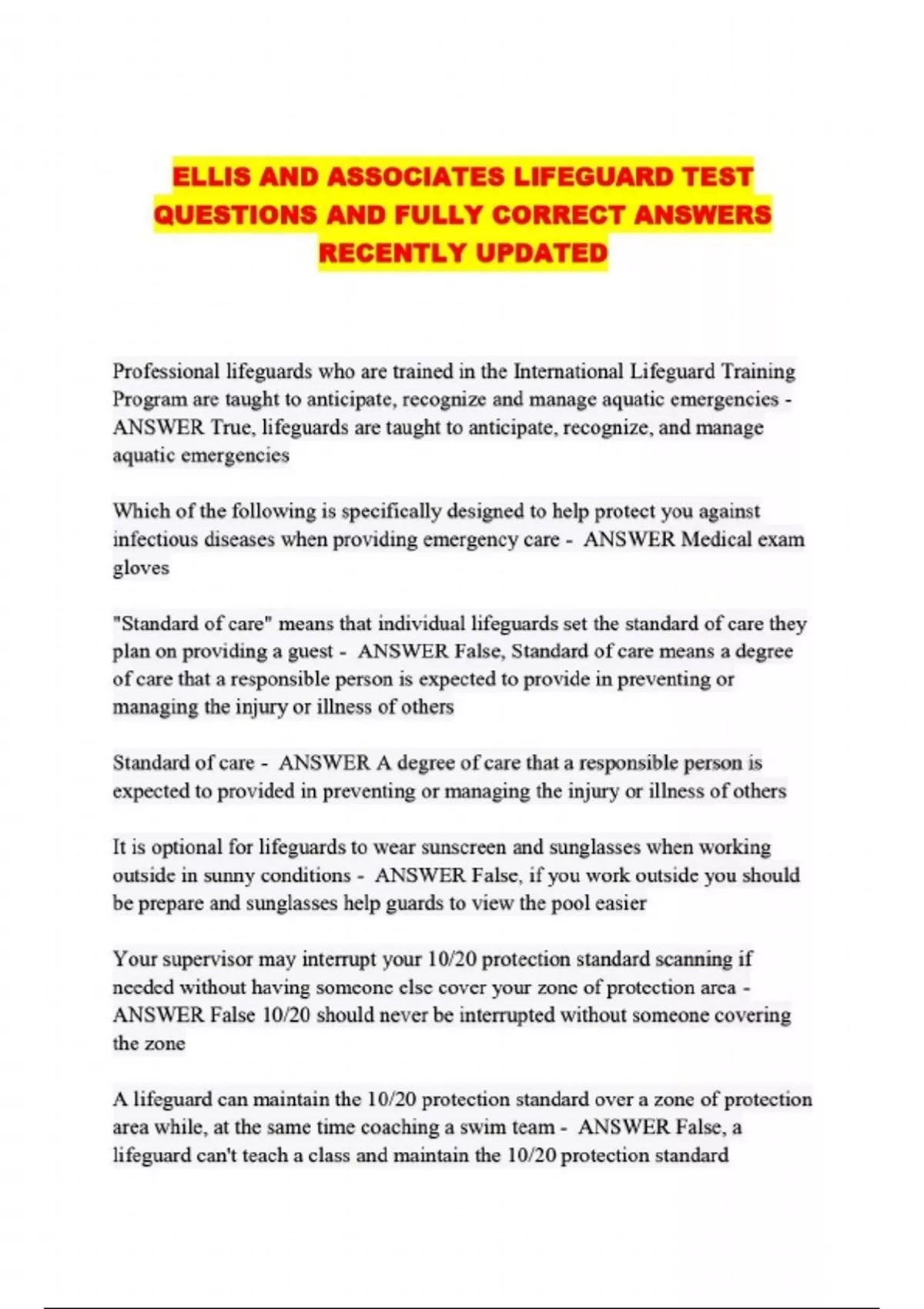 ELLIS AND ASSOCIATES LIFEGUARD TEST QUESTIONS AND FULLY CORRECT ANSWERS RECENTLY UPDATED