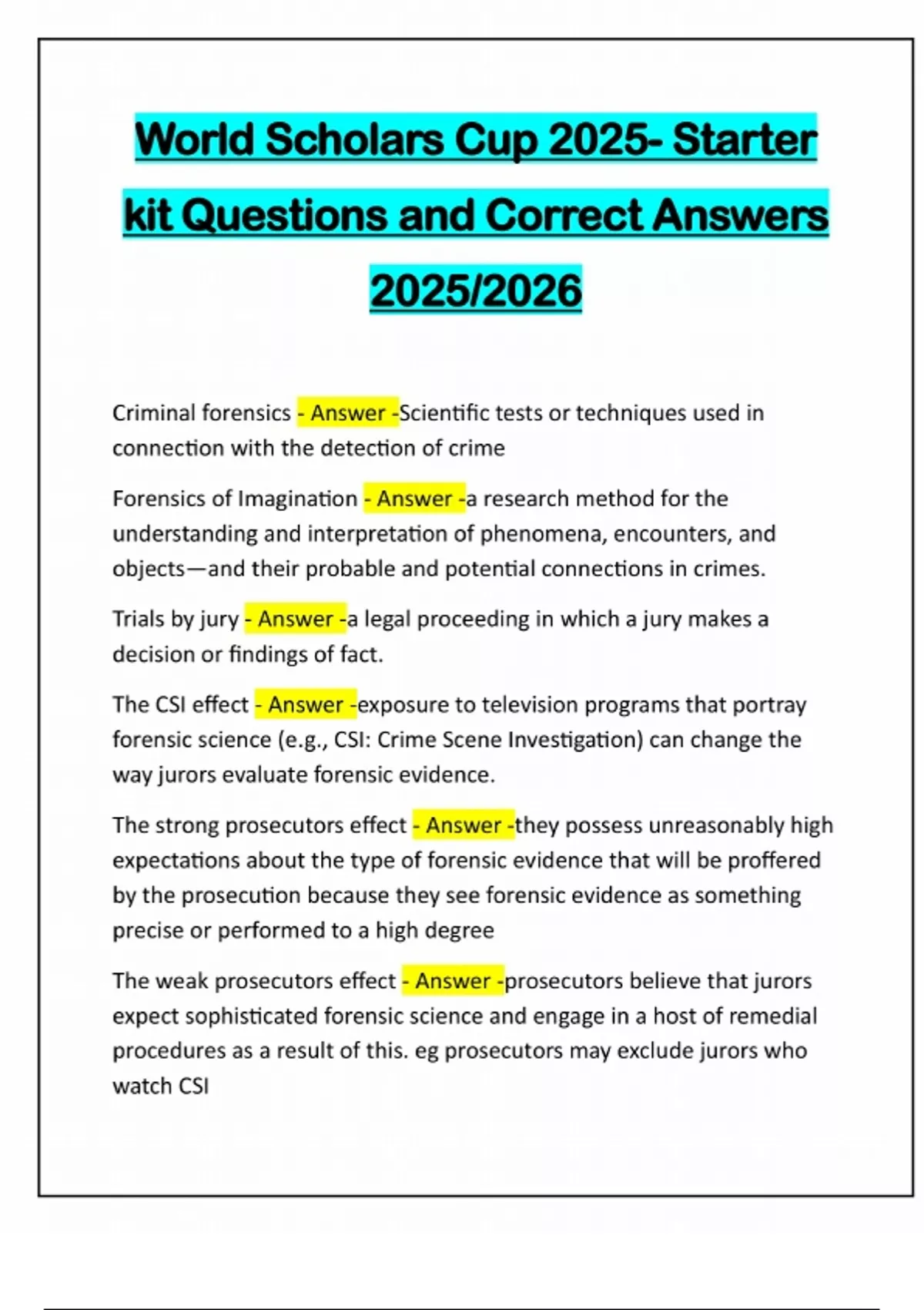 World Scholars Cup 2025- Starter kit Questions and Correct Answers 2025/2026 Criminal forensics - Answer -Scientific tests or techniques used in connection with the detection of crime Forensics of Imagination - Answer -a research method for the understanding and interpretation of phenomena, encounters, and objects—and their probable and potential connections in crimes. Trials by jury - Answer -a legal proceeding in which a jury makes a decision or findings of fact. The CSI effect - Answer -exposure to television programs that portray forensic science (e.g., CSI: Crime Scene Investigation) can change the way jurors evaluate forensic evidence. The strong prosecutors effect - Answer -they possess unreasonably high expectations about the type of forensic evidence that will be proffered by the prosecution because they see forensic evidence as something precise or performed to a high degree The weak prosecutors effect - Answer -prosecutors believe that jurors expect sophisticated forensic science and engage in a host of remedial procedures as a result of this. eg prosecutors may exclude jurors who watch CSIThe defendant's effect - Answer -The prosecution purportedly benefits from the jury's exposure to CSI The police Chiefs version - Answer -Criminals learn to avoid detection by watching shows like CSI The producers effect - Answer -Suggest that CSI has had an educational effect by popularizing forensic science. The educators effect - Answer -CSI informs young people as they decide to enter into careers of forensic science.
