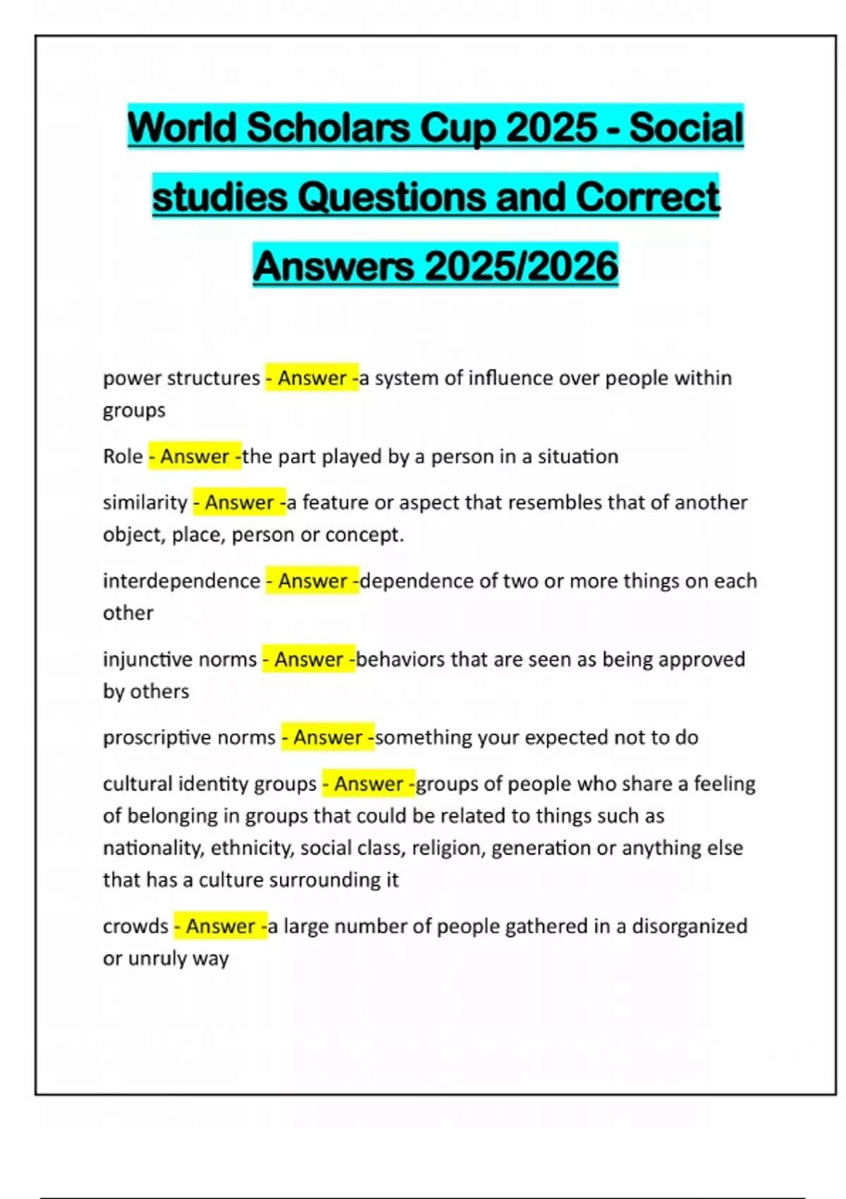 World Scholars Cup 2025 - Social studies Questions and Correct Answers 2025/2026 power structures - Answer -a system of influence over people within groups Role - Answer -the part played by a person in a situation similarity - Answer -a feature or aspect that resembles that of another object, place, person or concept. interdependence - Answer -dependence of two or more things on each other injunctive norms - Answer -behaviors that are seen as being approved by others proscriptive norms - Answer -something your expected not to do cultural identity groups - Answer -groups of people who share a feeling of belonging in groups that could be related to things such as nationality, ethnicity, social class, religion, generation or anything else that has a culture surrounding it crowds - Answer -a large number of people gathered in a disorganized or unruly waymobs - Answer -emotionally aroused groups ready to engage in violent behavior tuckman model - Answer -A model that describes five stages of team development: forming, storming, norming, performing, and adjourning seceder model - Answer -a model describing how the desire to be different can lead to the formation of groups Homan's theory - Answer -A theory based on three elements which are all needed to form a group. Activities, interaction and sentiments Social exchange theory - Answer -the theory that our social behavior is an exchange process, the aim of which is to maximize benefits and minimize costs in the outcome. Swarm behavior - Answer -a behaviour exhibited mostly by animals of similar sizes where they flock together,