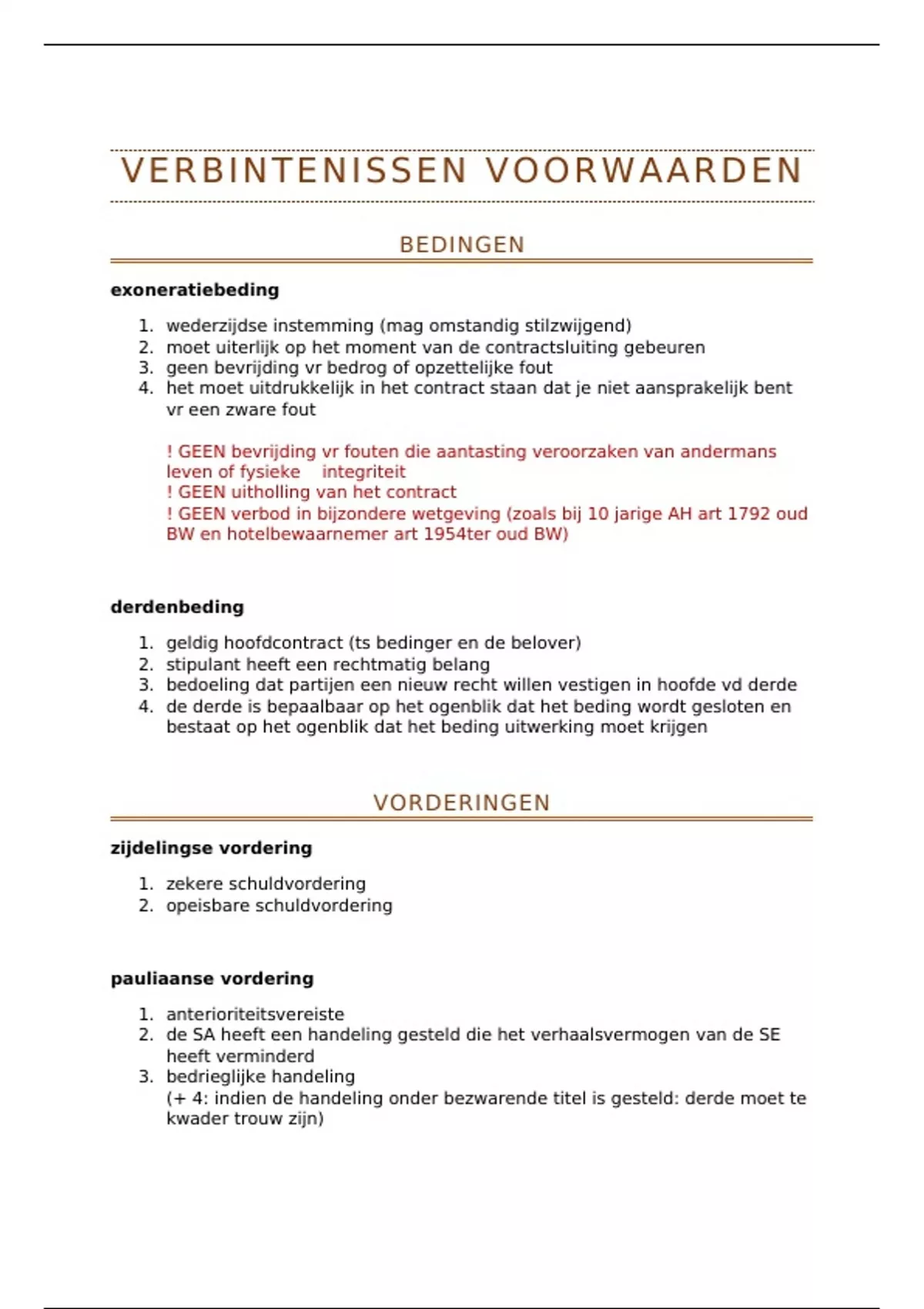 Samenvatting Alle voorwaarden te kennen voor examen verbintenissen