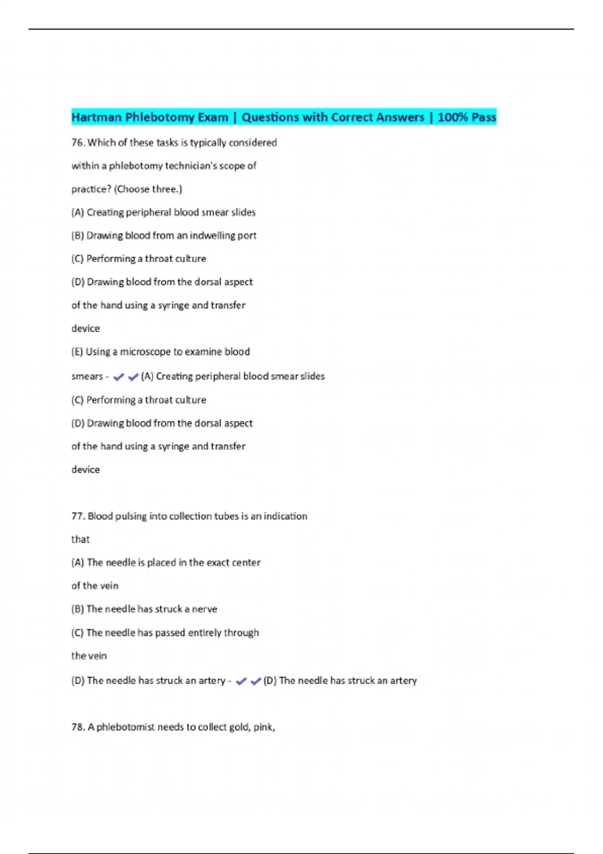 Hartman Phlebotomy Exam | Questions with Correct Answers | 100% Pass
