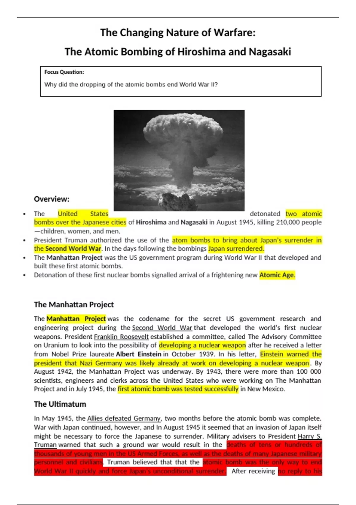personnel and civilians. Truman believed that that the atomic bomb was the only way to end