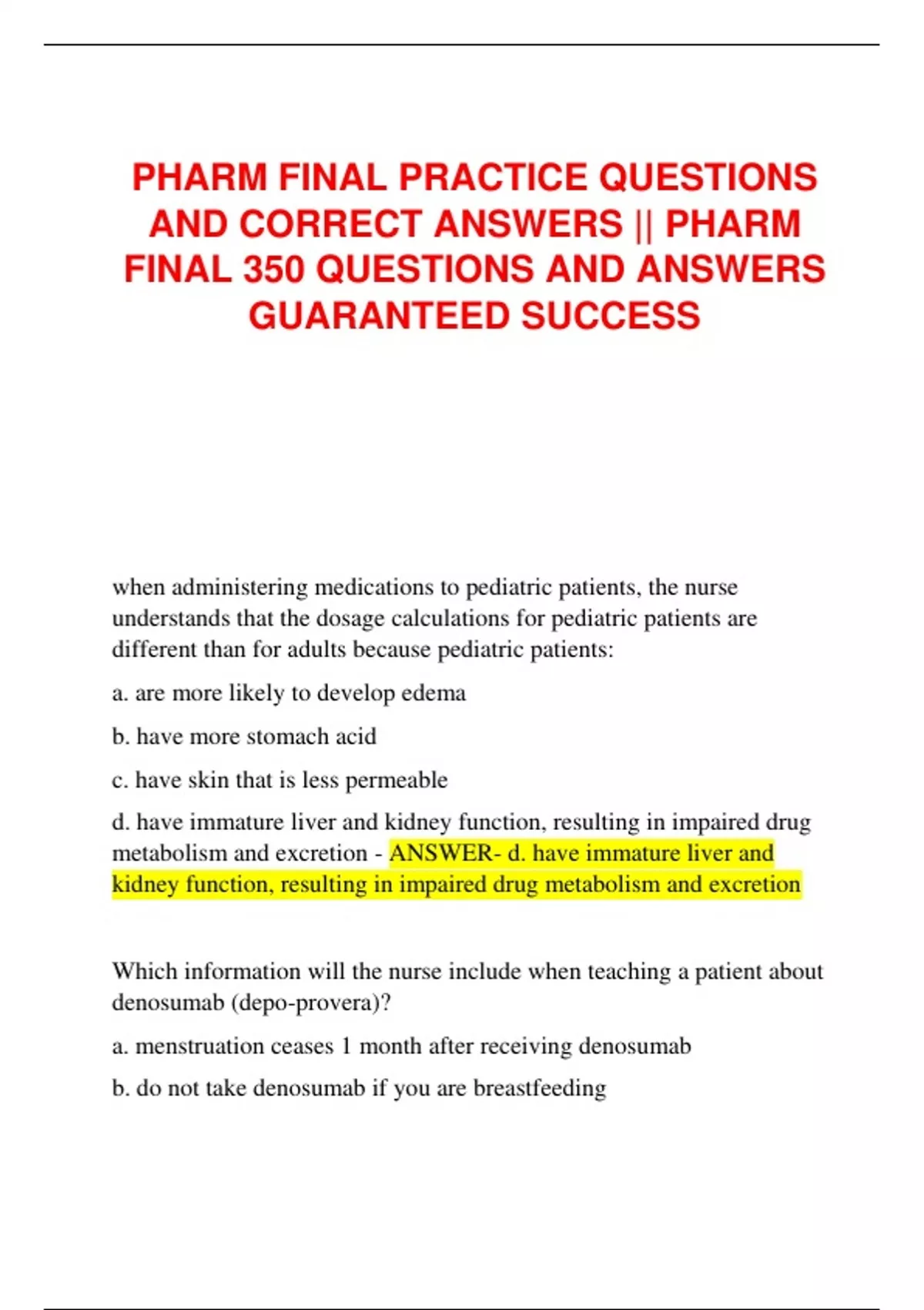 PHARM FINAL PRACTICE QUESTIONS AND CORRECT ANSWERS || PHARM FINAL 350 QUESTIONS AND ANSWERS GUARANTEED SUCCESS