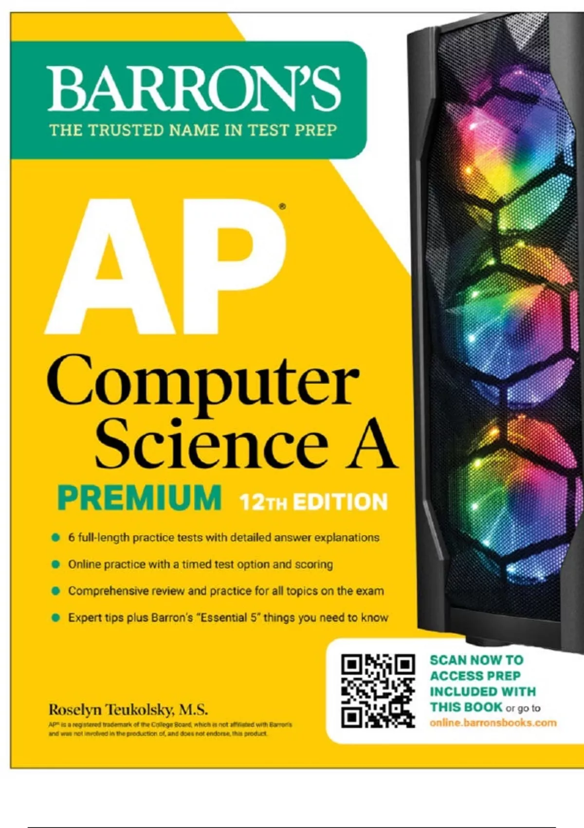 Download AP Computer Science A Premium, 12th Edition PDF by Barron’s Educational Series and Roselyn Teukolsky M.S. Includes 6 full-length practice tests, in-depth Java concept reviews (OOP, data structures, algorithms), and interactive online coding labs. Instant access—master AP CSA and ace your exam today!