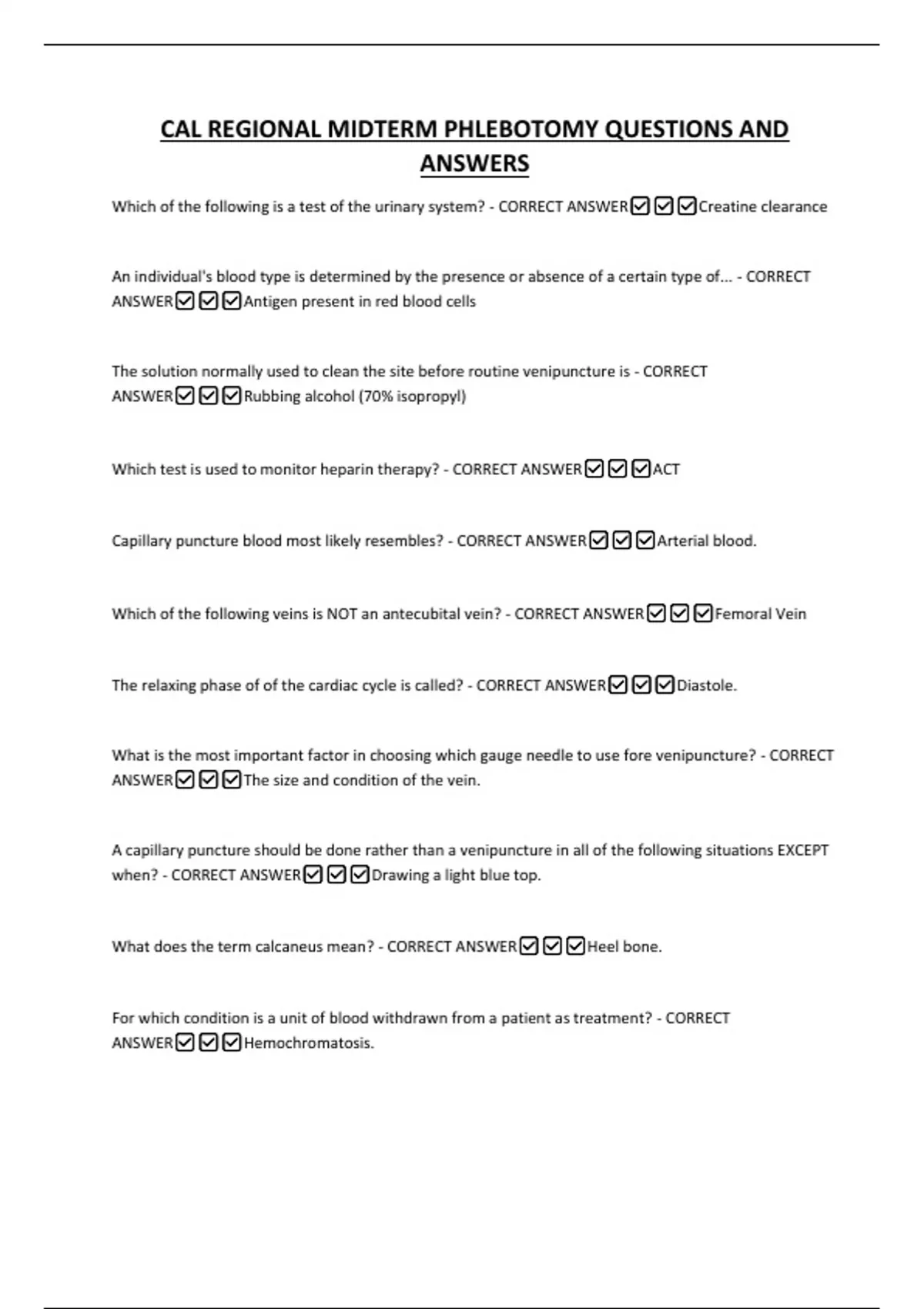 CAL REGIONAL MIDTERM PHLEBOTOMY QUESTIONS AND